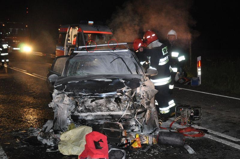 Dwóch mężczyzn, jadących Fordem zostało zakleszczonych w mocno rozbitym pojeździe. Strażacy przez kilkanaście minut uwalniali ich przy użyciu sprzętu hydraulicznego. Dodatkowym utrudnieniem był fakt, że samochód stał niestabilnie na skarpie, wobec czego musiał być asekurowany na linie przyczepionej do wozu pożarniczego.