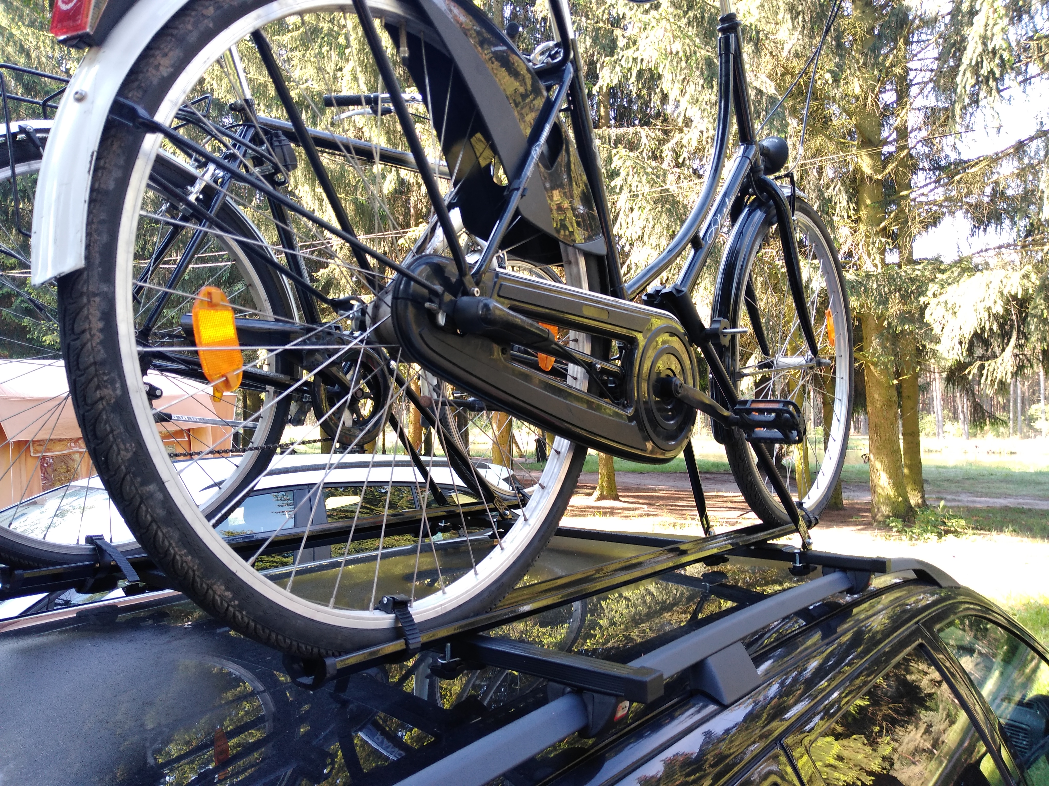 Mając pewne doświadczenie w wożeniu rowerów na dachu, zawsze wiążę je ze sobą porządnie spięte za pomocą ekspanderów z hakami na końcach. To zapobiega dygotaniu bicykli nawet przy szybkościach rzędu 130-140 km/h. Stoją sztywno jak przyspawane. Dodatkowo spinam je ramą z belką bazową bagażnika za pomocą stalowej linki, zabezpieczenia antykradzieżowego. Przy kolizji z normalną prędkością jest szansa, że to zatrzyma rowery i nie pożeglują na wprost. Przy większych prędkościach nic nie pomoże.