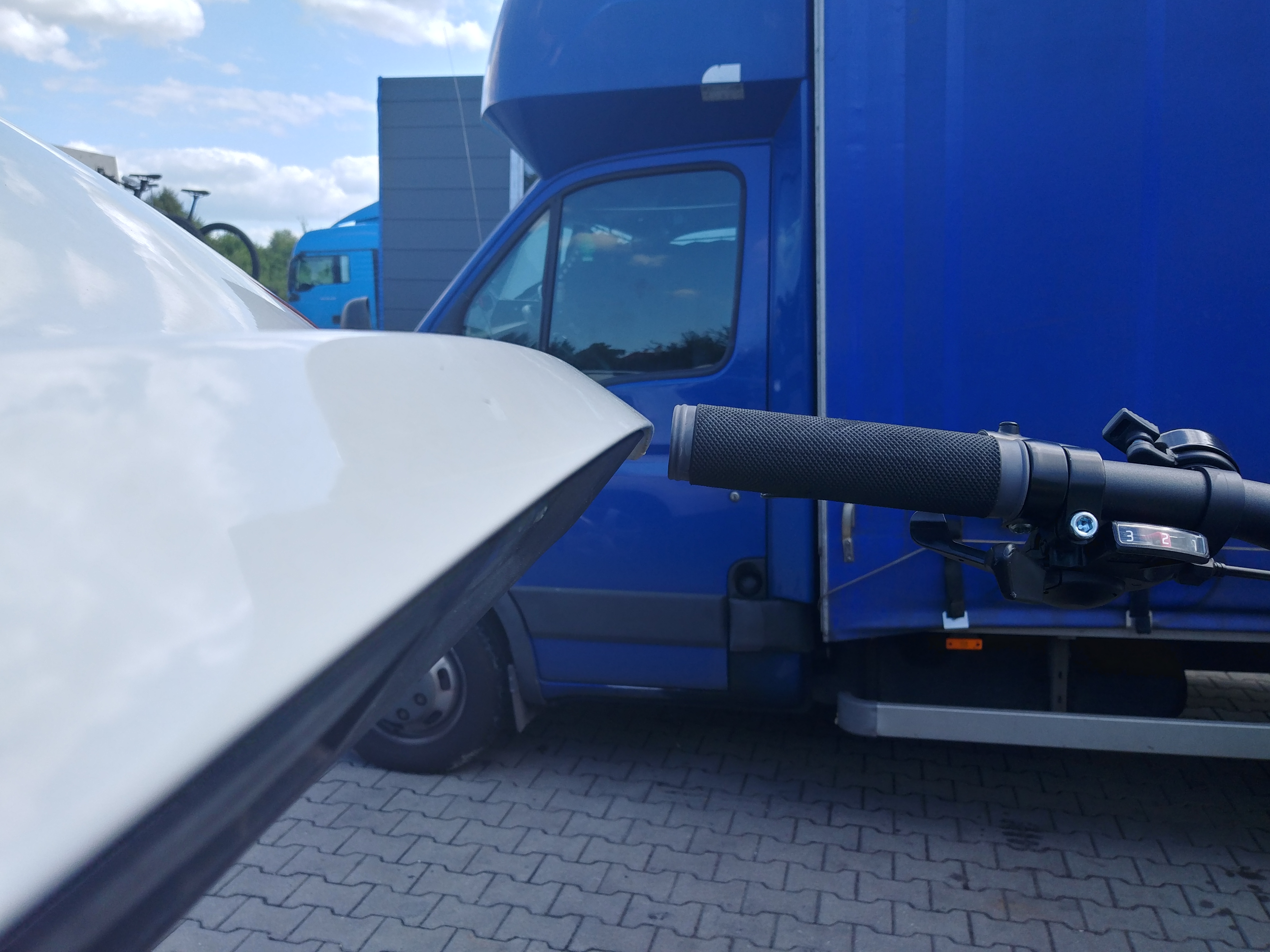 Bałem się początkowo, że zawadzę bagażnikiem o lakier samochodu, dlatego asekuracyjnie poprosiłem żonę, żeby zerkała jak wyjeżdżam z podwórka. Wyjazd mam dość ciężki, brama jest dość wąska, za bramą mam z górki, a uliczka jest tak wąska, że jak się wyjeżdża samym samochodem na wprost to rzadko się udaje wyjechać tak, żeby samochód stał prosto (kąt 90stopni) na ulicy bez poprawki, dlatego z reguły już z podwórka wyjeżdżam pod kątem, żeby się wyrobić na raz. Dalej nie mogę pojechać niż poza ulicę, bo sąsiad z naprzeciwka ma płotkiem ogrodzone swoje drzewka.