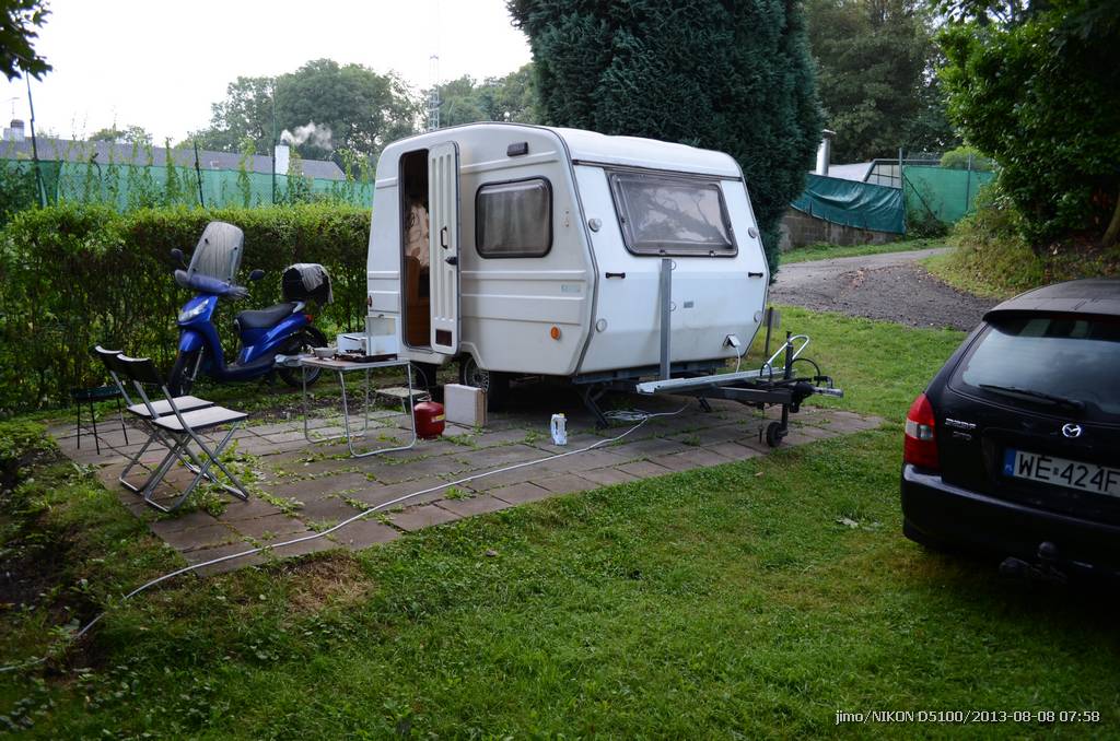 Od razu na kemping: http://city-camping-berlin.de (City Camp 1; Gartenfelder StraBe 1, 13599 Berlin-Siemensstadt). Wolne miejsce było bez problemu, przyczepy i kampery ustawiane "ciasno" brak wydzielonych parceli - czyli jak kto stanie tak stoi... :). Wtedy przypomniałem sobie o czym zapomniałem, że trzeba zrobić jeśli chodzi o techniczne wyposażenie przyczepy... przejściówka do podłączenia elektrycznego. Pomocny był człowiek z recepcji który za jedyne 20e wypożyczył taki adapter. Następnego dnia udaliśmy się do OBI po wtyczkę, gniazdo i 50cm przewodu i robiłem swoją - niestety koszt materiałów ~18e - masakra... no ale gapowe trzeba zapłacić. Kemping w Berlinie bez fajerwerów, wifi jest w recepcji, płatne, podłoże raczej ziemia (gdzieniegdzie niezadeptana trawa). Sanitariaty czyste, zadbane, woda do oporu. Teren zalesiony pomiędzy dwoma kanałkami (o dziwo nie było komarów), bardzo blisko lotniska. Typowa miejscówka wypadowa do zwiedzania - wyjeżdżasz rano, wracasz wieczorem i idziesz spać. Blisko do atrakcji turystycznych (~12/15km - więc 20 minut skuterem i jesteśmy w samym "sercu" Berlina). Jeszcze w sobotę wieczorem mały rekonesans po mieście - Brama Brandenburska, wieża telewizyjna (świetny widok z góry ponad 200m wysokości + szybkie windy 6m w 1sekundę) + ogólne zapoznanie się z centrum, kolacja w knajpie. Foty poniżej.