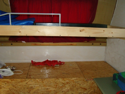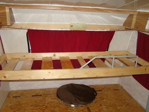 jeśli chodzi o aranżację wnętrza to ja bym zrobił tak ... skoro szafki kuchennej nie chcesz to w jej miejscu komodę bym zmontował, szerokość i głębokość jak ta szafka ale wyższa, nad nią wzdłuż przyczepy piętrowe łóżko składane na dzień, umocowane do ściany za szafką, po rozłożeniu częściwo na szafce wsparte... rozkładane wahadlowo jak tylne fotele pasażerskie z Żuka