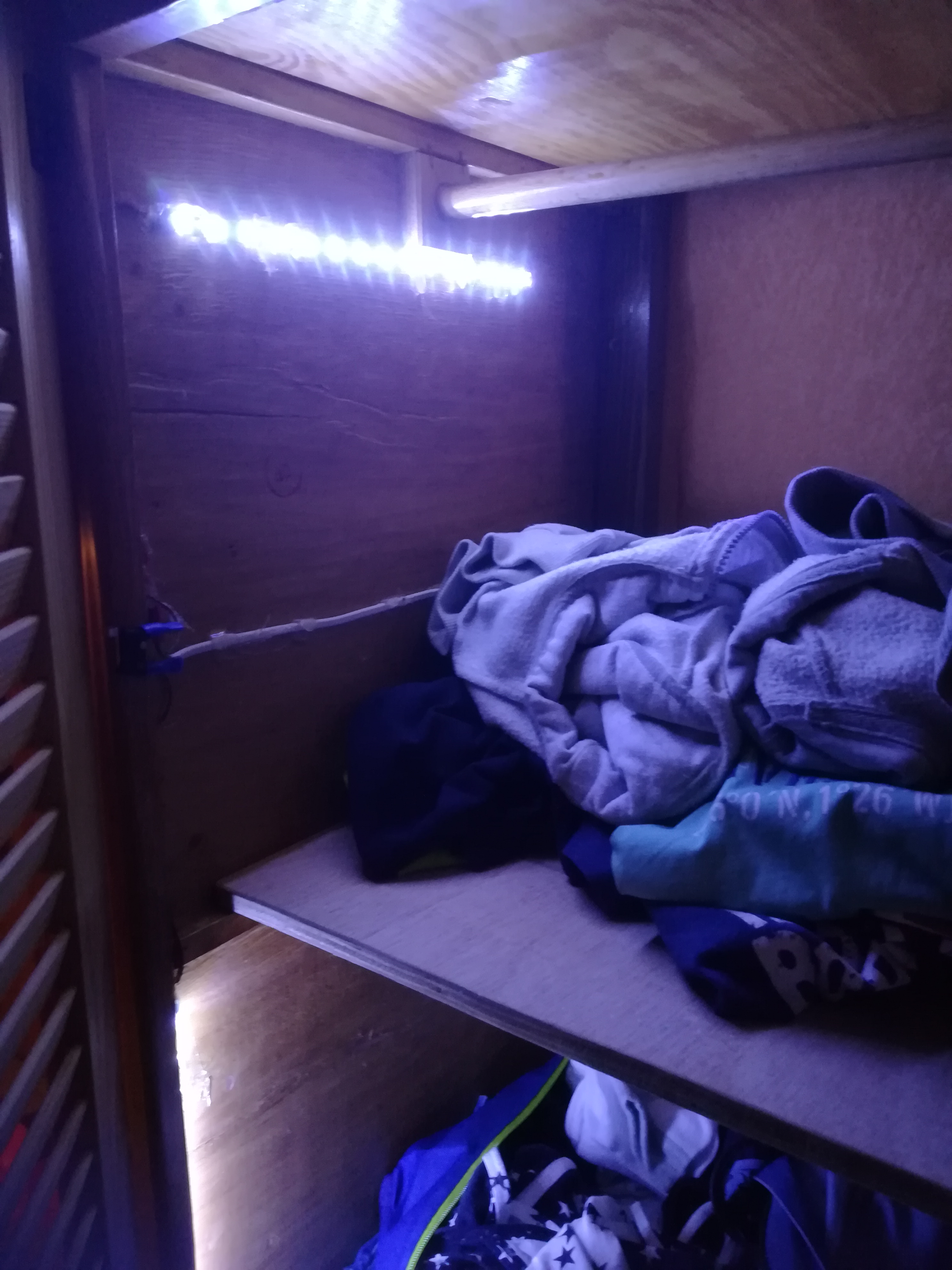 Co by żona po zmroku mogła w szafie grzebać nie budząc przy tym szkodnika zapalonym światłem zamontowałem oświetlenie na mikrowyłączniku. Wykonanie nie mistrzostwo świata ale sprawdza się i daje radę.