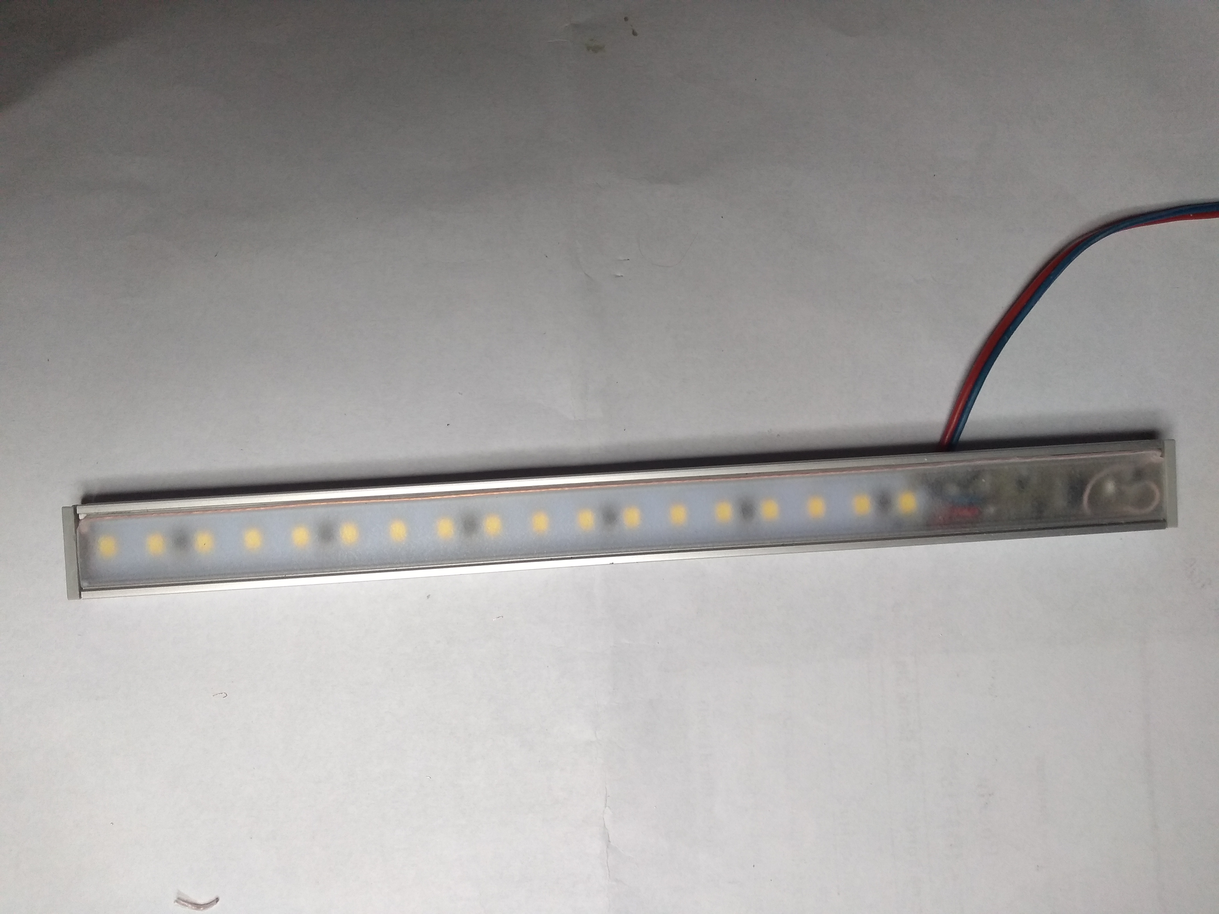 Taśma led wykorzystana do lampy to taśma na sztywnym, aluminiowym podkładzie zawierająca 120 diod typu 2835 na 1 m, o strumieniu świetlnym 2100 lm/1 m i pobieranej mocy 20 W/1 m. W lampie zastosowałem odcinek taśmy z 18 diodami. Diody te wydzielają dość dużo ciepła, dlatego konieczne jest przyklejenie aluminiowego podłoża do profilu klejem termoprzewodzącym, aby profil mógł służyć jako radiator odprowadzający ciepło.