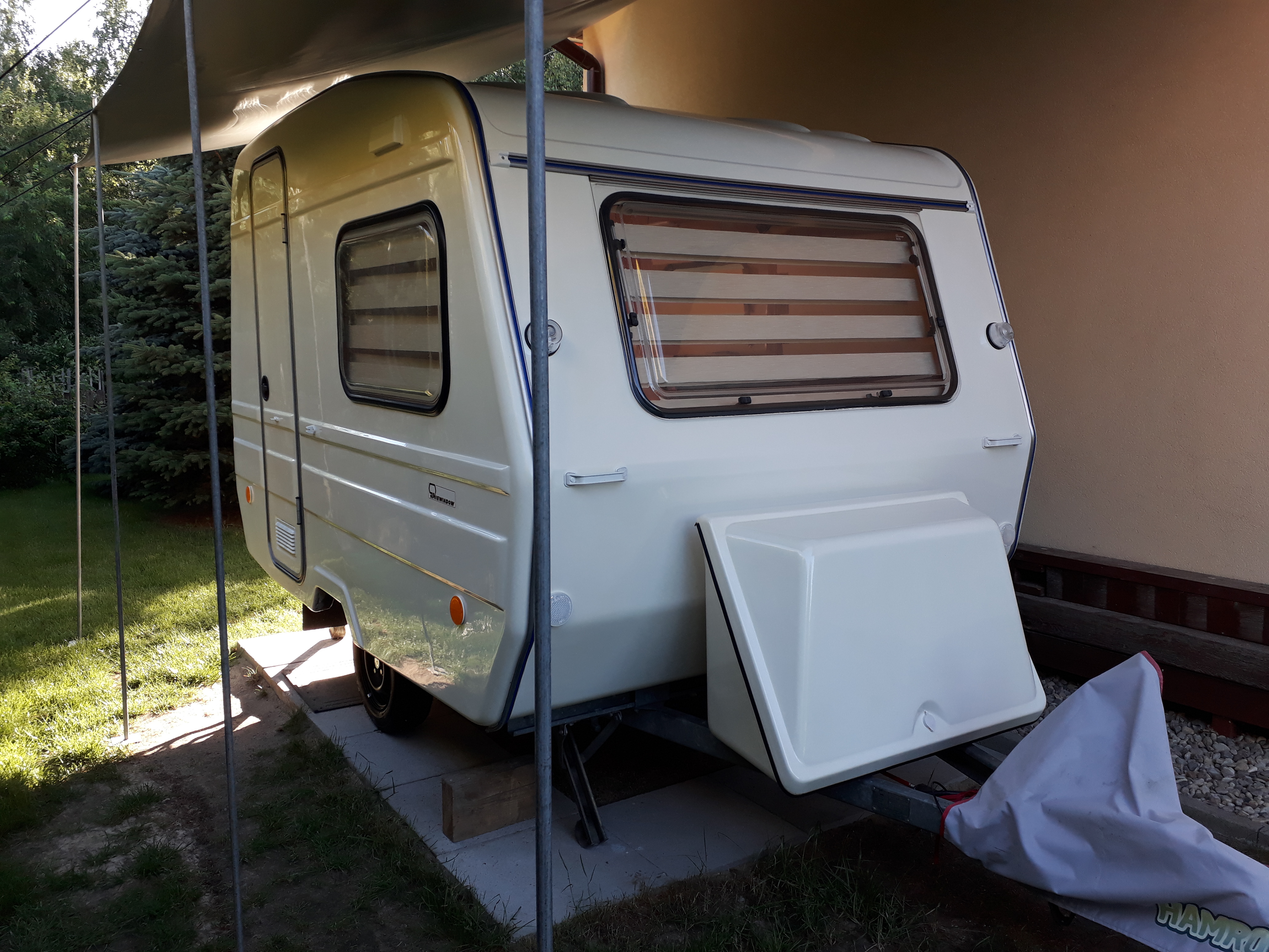 Potwierdzę że plandeka sprawdza się rewelacyjnie o każdej porze roku na tarasie. Ale wiatę na przyczepę, ze względu na wielkość połaci dachowej przykryłem trapezem.