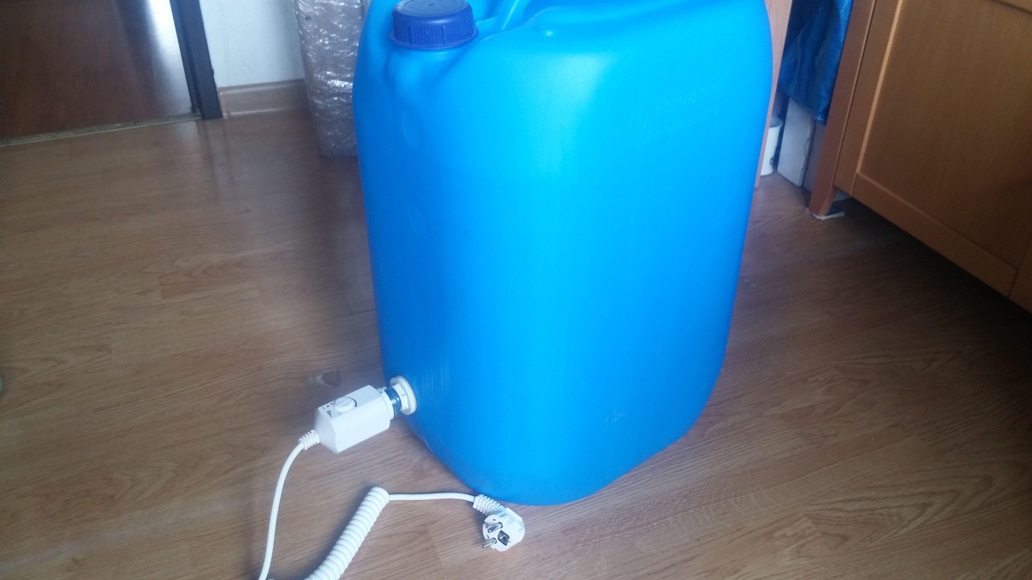tez myslalem nad grzalka akwariowa ale ale troche niepodobalo mi sie to ograniczenie termostatu do 30stopni max i wymiary 33cm dluga (problem z baniakiem w ktory by weszla na dno na lezaco). No i do grzalki nawet akwariowej musi byc dostep do zasilania 230v wiec idac tym tropem poszperalem na allegro i znalazlem grzalke z termostatem ktora grzeje do 65stopni i ma 600W (sa dostepne rowniez 300W). Wydaje mi sie ze ten pobor pradu nie jest za duzy i na polach kempingowych bez problemu da rade. Wzielem sie za grzebanie i wyszlo cos takiego: (patrz fotki)