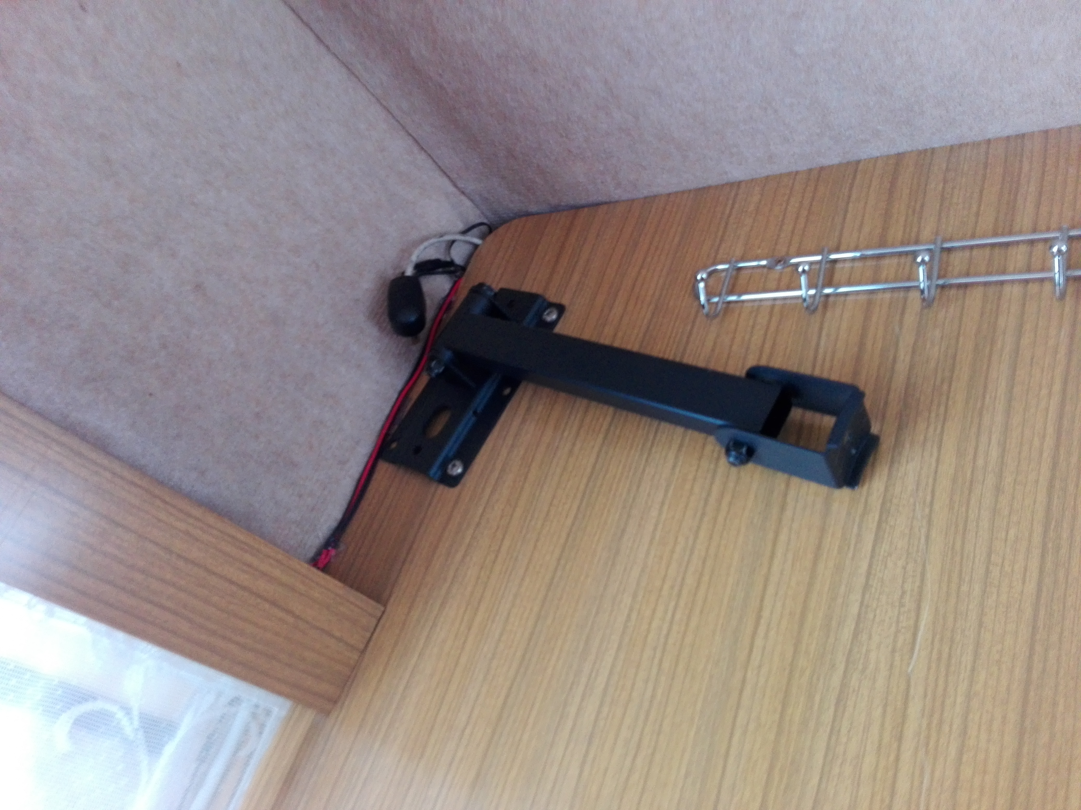 Zasilanie TV i anteny w suficie szafy, a z boku wystają tylko końcówki do podłączenia. Oczywiście, podczas przejazdów TV jest demontowany. TV Mistral 19' z wbudowanym dekoderem DVBT. Jest lekki i względnie mało prądożerny.