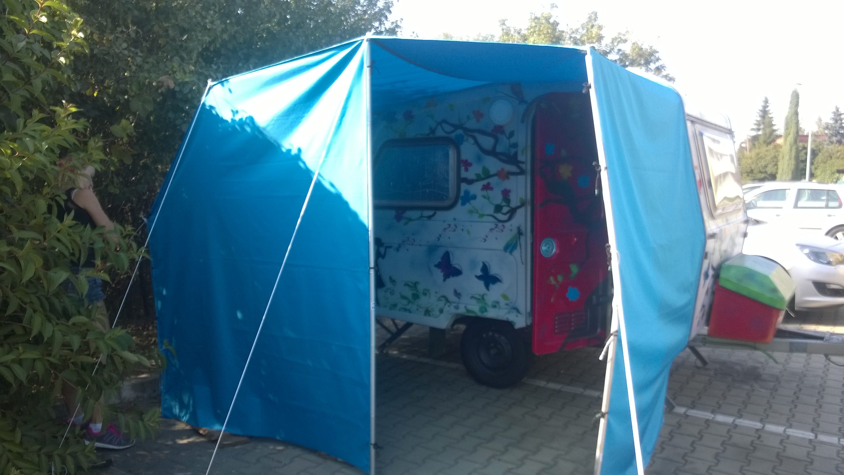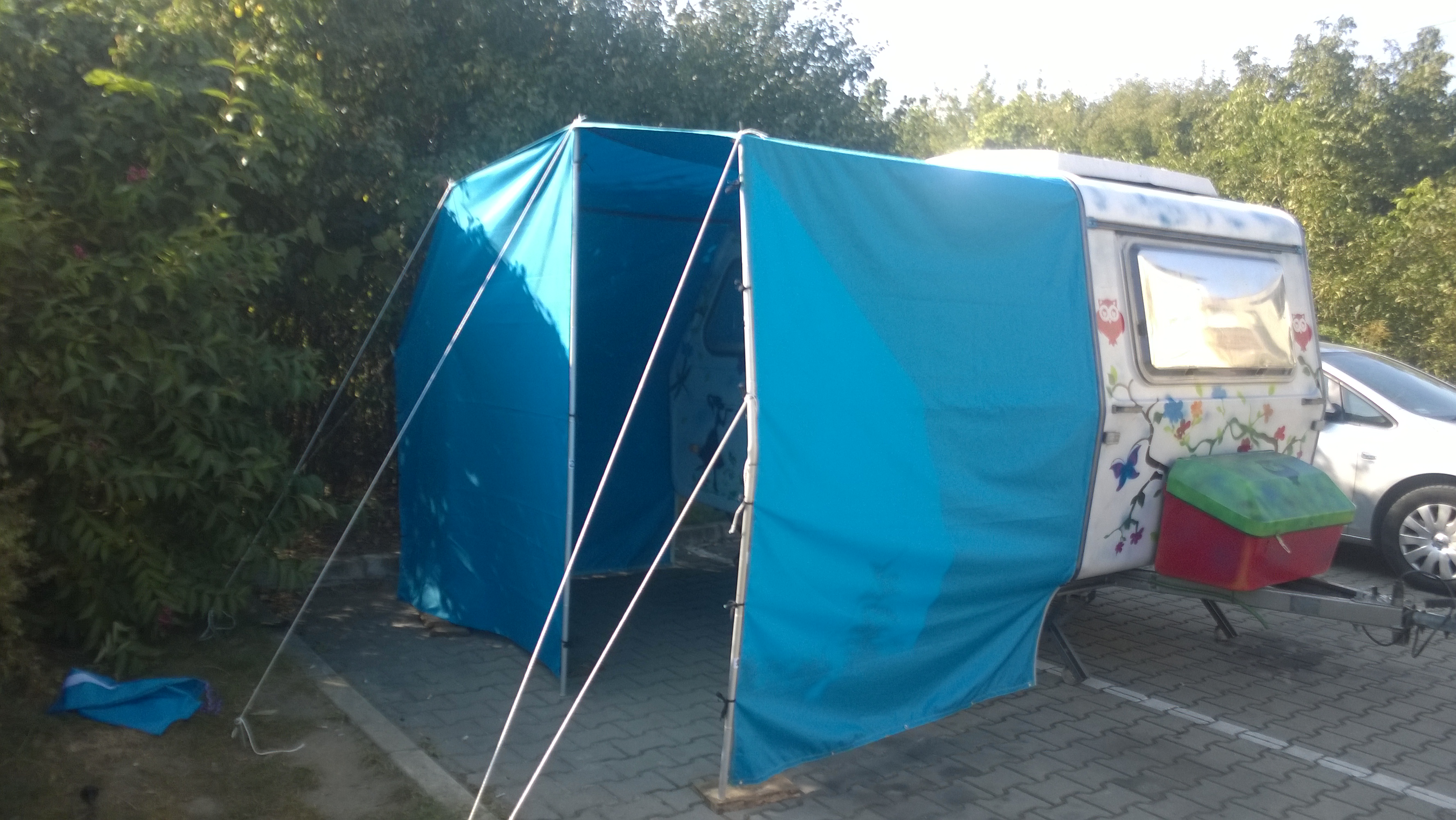 Jak wielu z was, po zakupie niewiadki, myśleliśmy "po co przedsionek". Pierwsze wyjazdy zweryfikowały częściowo ten pogląd, uznaliśmy, że potrzebujemy czegoś, co będzie połączeniem daszku i przesionka. Zwykły przedsionek jest naszym zdaniem za duży, więc uczyniliśmy coś, co naszym zdaniem łączy zalety daszku i pełnego przesionka. Drogą kupna nabyliśmy 9 m.b, wodoodpornego materiału na plandeki o szerokości 160cm, wzdłuż dłuższego boku (6,2m)wszyliśmy kedrę, i przy pomocy 4 masztów do pałatek wojskowych powstał całkiem sympatyczny tunel ochraniający budkę z góry i po bokach na szerokość 1,5m. Z przodu, od tyłu budki do środkowego masztu wszyliśmy ściankę ochraniającą pół boku przyczepki od frontu. Pozostało wejście naprzeciw drzwi. Po testowym rozłożeniu (dziś po południu na parkingu osiedlowym) - efekt przerósł nasze oczekiwania. Uczyniliśmy całkiem funkcjonalny przedsionek, który naszym zdaniem, wymiarami wystarcza do swobodnego posiedzenia przy piwku w deszczowy dzień i jednocześnie nie zajmuje hektarów przed cepką (opłaty na campingach). Rozłożenie w 2 osoby zajmuje z zegarkiem w ręku 5 min.