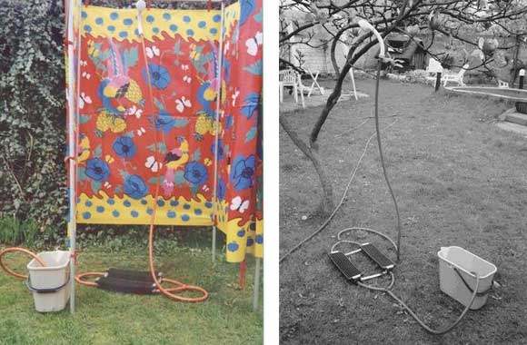 Prysznic turystyczny działa na zasadzie zaworów zwrotnych, pozwalających na zasysanie wody z dowolnego pojemnika. Przenosząc ciężar ciała z nogi na nogę powodujemy zassanie wody i pompowanie jej do słuchawki prysznica.