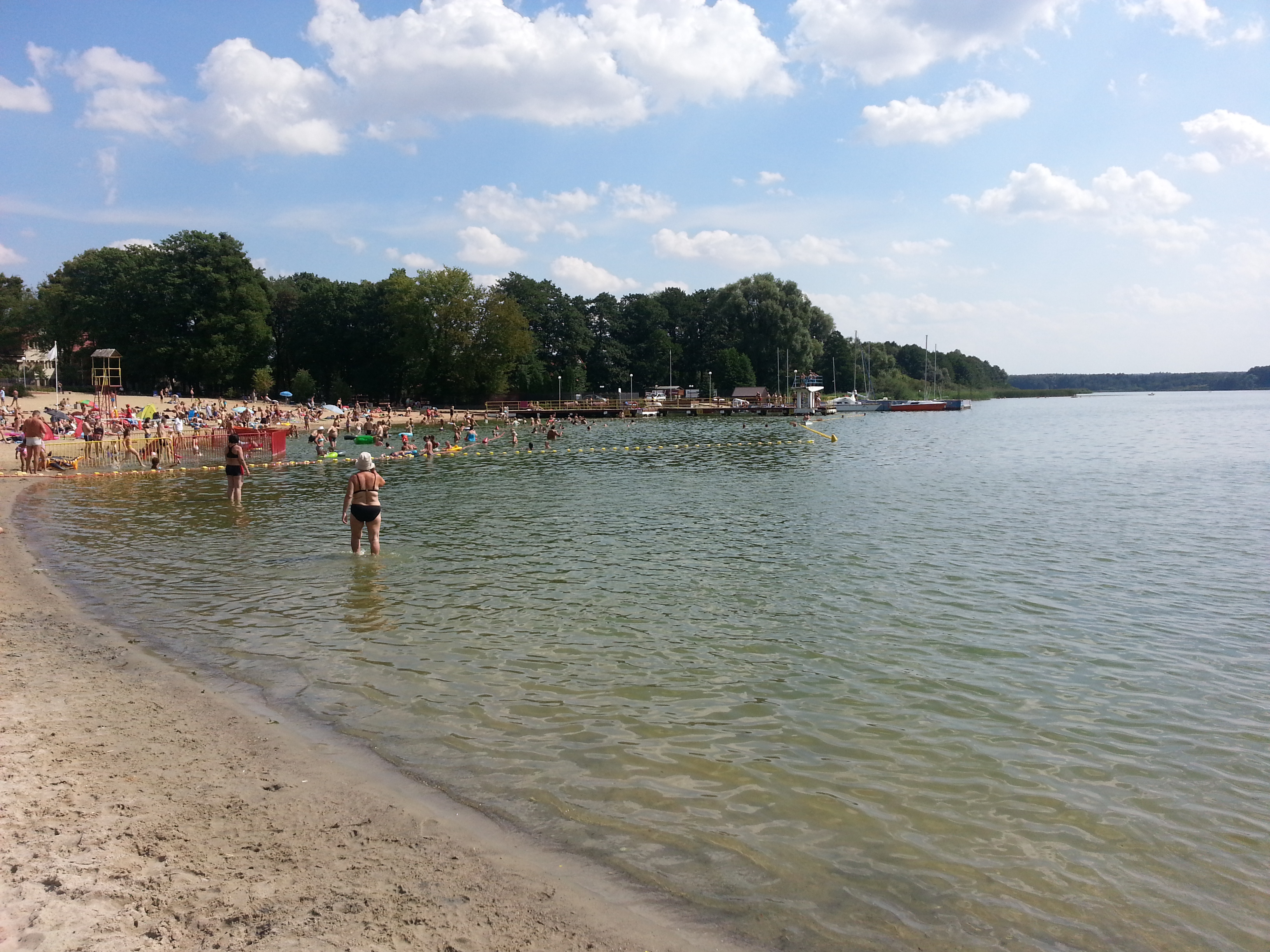 ciepła woda w jeziorze, ratownik WOPR, odgrodzone sekcje na wodzie wzgl. na głębokość trochę trawy z dwoma betonowymi kominkami/grillami, ławki, stoły w cieniu, wieczorem wstęp bezpłatny.