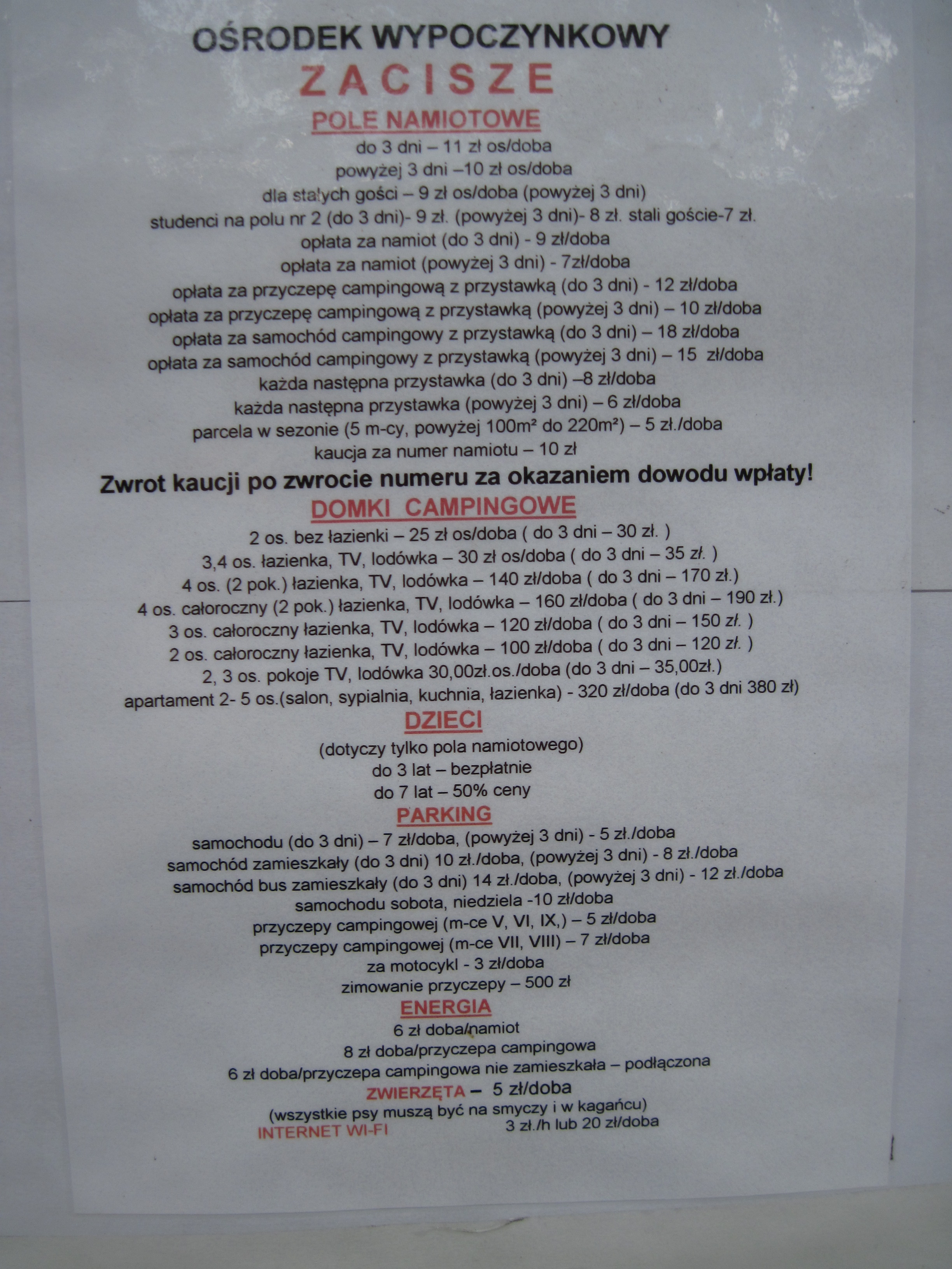 Korzystając z cennika trzeba pamiętać że pomimo że jesteśmy liczeni za osoby, przyczepę, prąd zgodnie z cennikiem to trzeba jeszcze doliczyć opłatę za parking samochodu :(