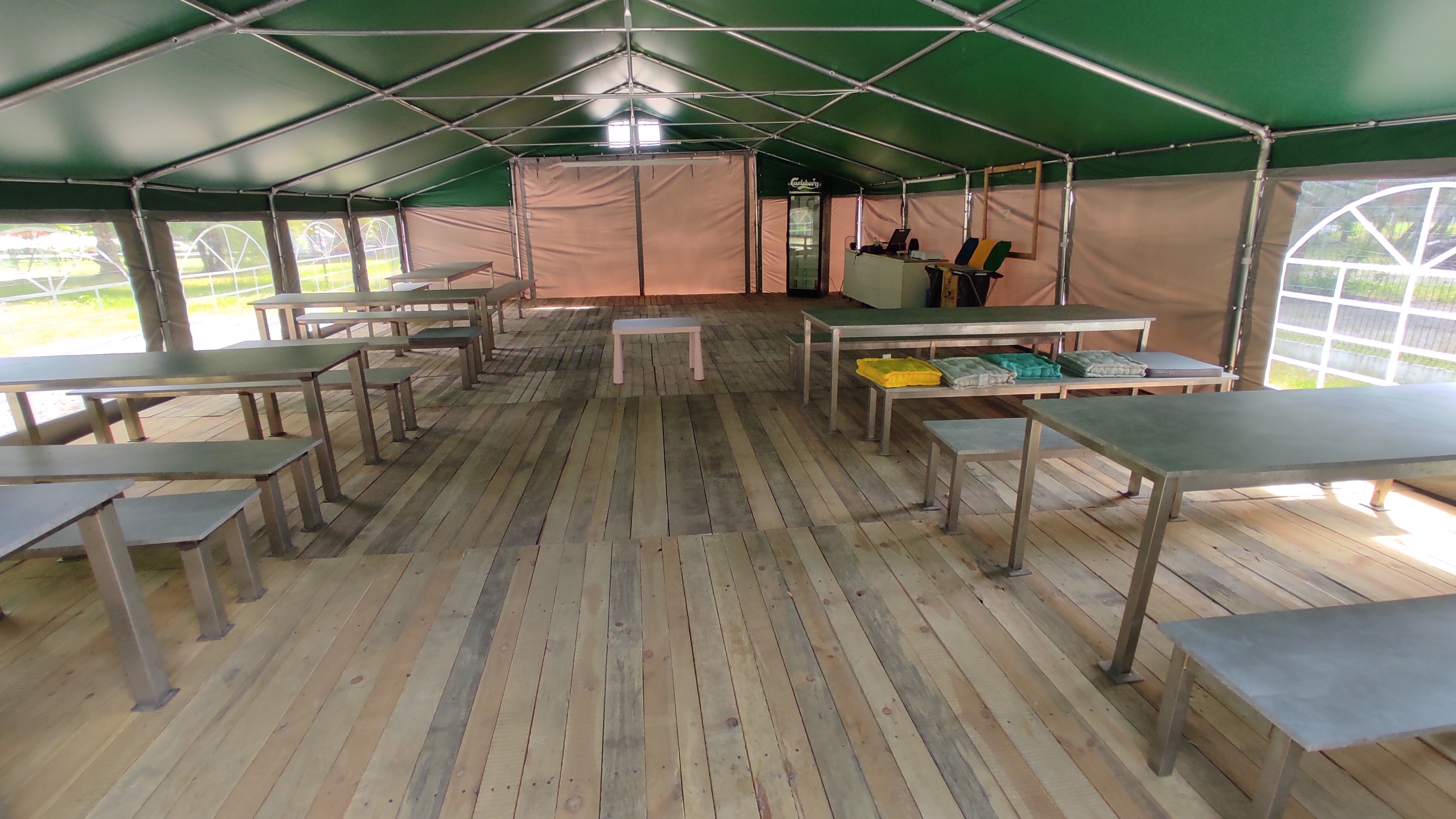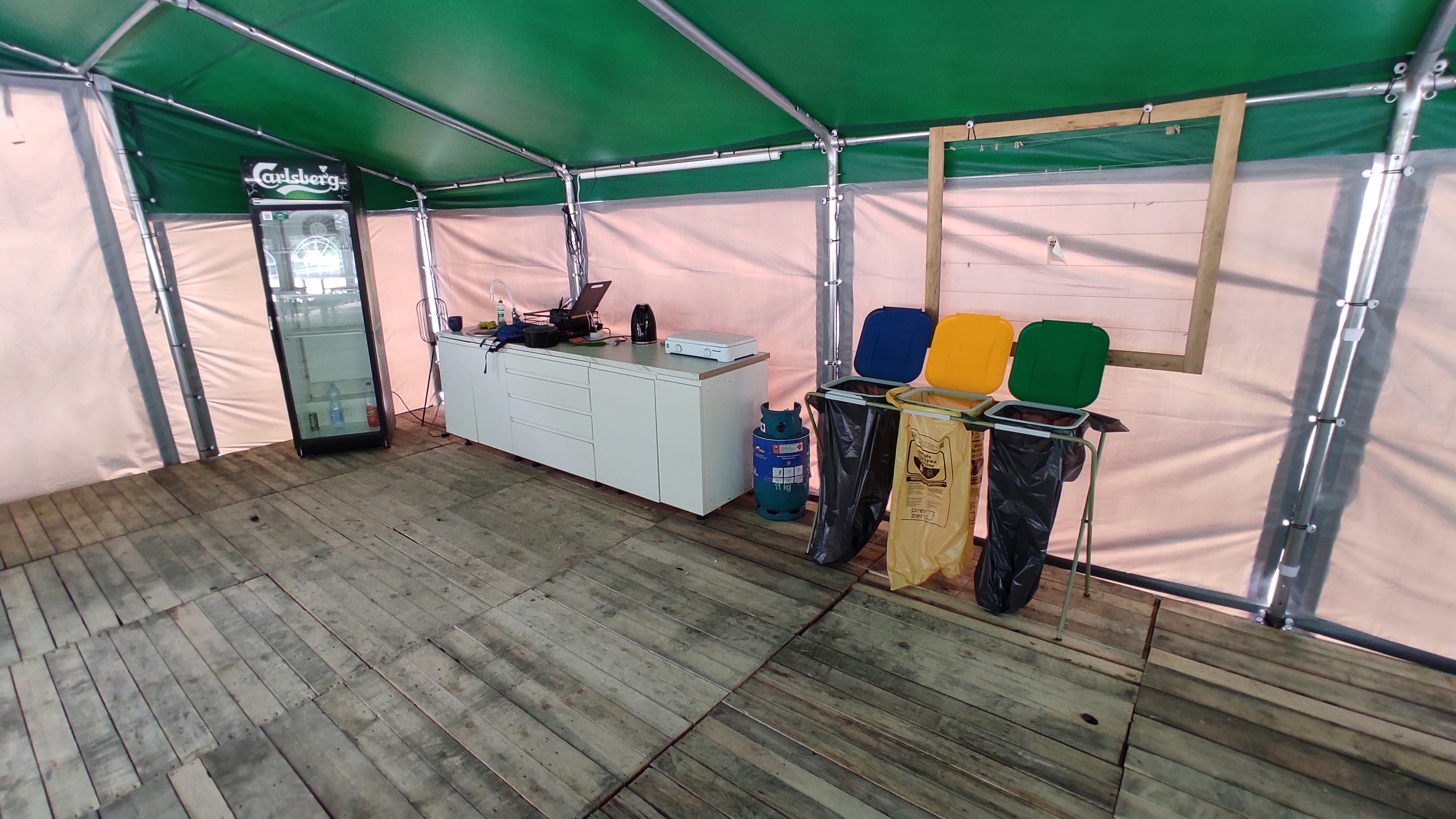 Namiot gdzie można sobie posiedzieć, coś upichcić w aneksie kuchennym w rogu, a na wprost opuszczany ekran do rzutnika i wieczorem są wyświetlane bajki lub inne filmy.