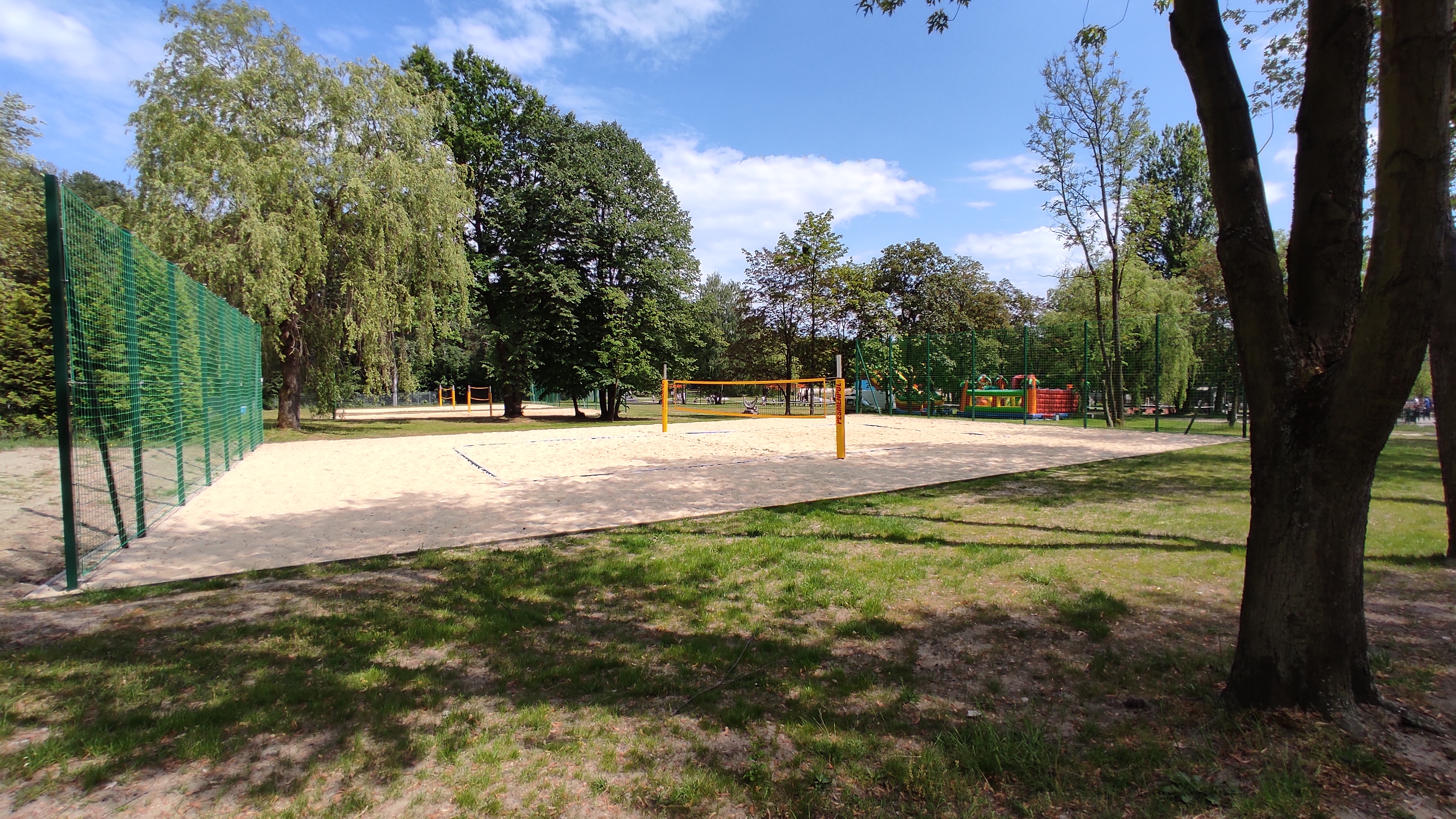Nowe boiska do siatkówki plażowej. W tle dmuchańce i nowa "ścieżka zdrowia"
