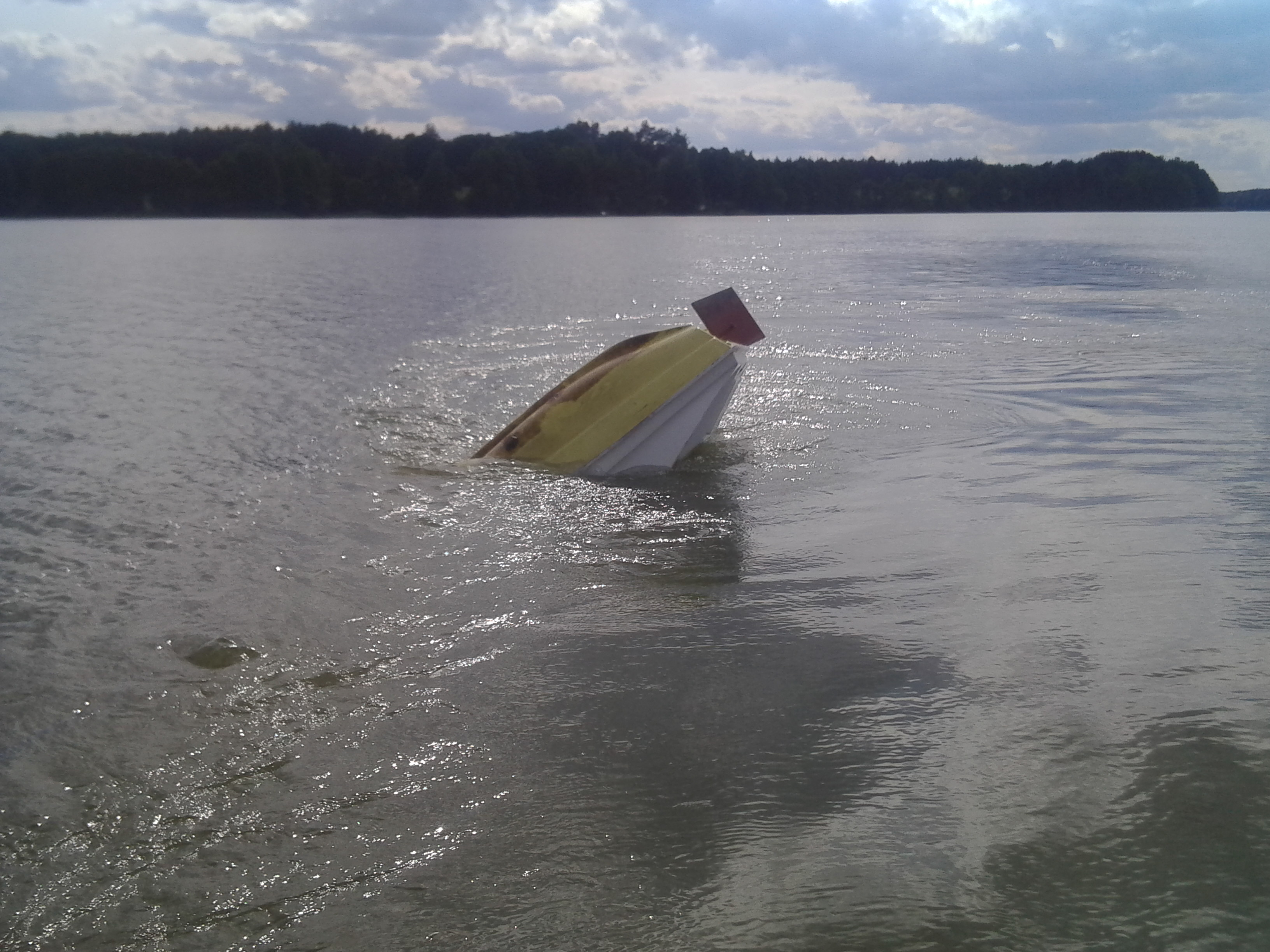 Odbyliśmy godzinną wycieczkę na wyspę Ostrów (polecam), a potem wsiedliśmy na rower i z powrotem. Kilkaset metrów od brzegu stan rzeczy zaczął budzić nasze podejrzenia - lewy tył roweru zdawał się być bardziej zanurzony niż prawy, ale stwierdziłem że to pewnie kwestia tego że jedno waży mniej drugie więcej i wszystko jest ok. Nie było. Zauważyłem bowiem że rowerem się trochę gorzej steruje jak wymijam żaglówki. Obraliśmy więc kurs prosto na brzeg byle wysiąść bezpiecznie bo widać było wyraźnie że coś jest nie tak, ale obserwowałem na bieżąco zanurzenie i się nie zwiększało. Do momentu kiedy nagle zaczął nabierać wody do środka oraz zaczęła się przelewać przez burtę. Do brzegu na oko 50m (na wodzie trudno mi ocenić), więc zacząłem krzyczeć że pomocy toniemy na szczęście obok była jakaś ekipa na pontonie która się po ludzku zachowała rzuciła nam linę wzięli nasze graty do siebie i wezwali WOPR. Tu wielkie podziękowania i wyrazy uznania dla ratowników WOPRU, który na miejscu byli swoją motorówką nie wiem po 30 sekundach? Wyciągnęli nas i zholowali rower (załączam fotkę holowanego roweru chwilę po tym jak go opuściliśmy).