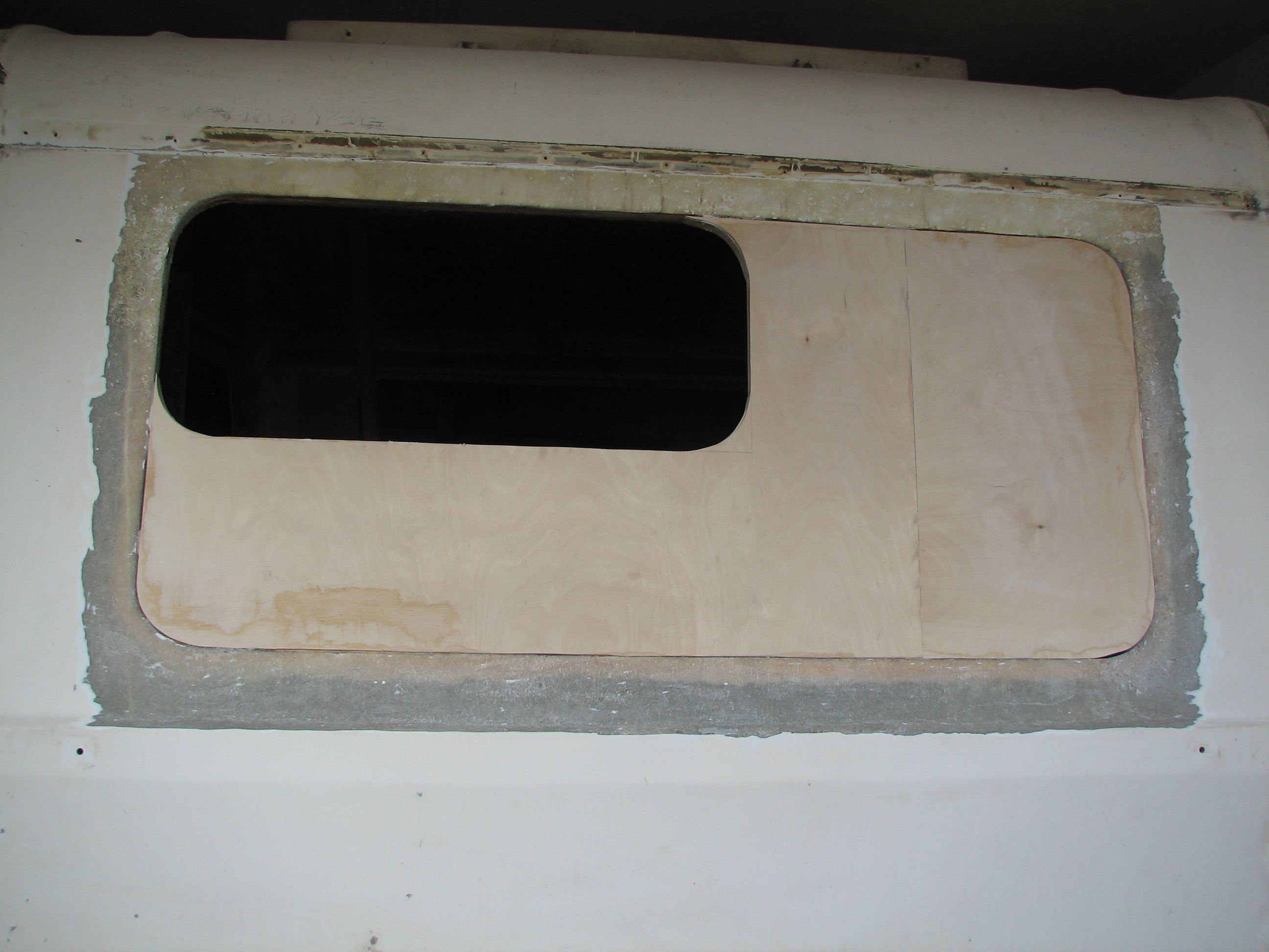 Teraz nadszedł wreszcie czas na tworzenie czegoś nowego. Już kilka lat temu wyposażyłem moją przyczepę w toaletę. Ponieważ wtedy nie robiłem aż tak kapitalnego remontu, nie rozwiązałem problemu przedniego okna. Żeby nie stwarzać na campingu dodatkowych atrakcji, część szyby zachodzącą na kabinę toaletową wyłożyłem matową folią, ale pozostał problem otwierania okna, bo dwa z czterech zaczepów zamykających okno były dostępne z toalety. W związku z tym postanowiłem wymienić przednie okno. Zastanawiałem się nad zastosowaniem oryginalnej szyby od N126et, ale była ona trochę za szeroka i zmusiłoby to do powiększenia otworu okiennego w kierunku prawej ściany przyczepy. I wtedy trafiłem na szybę nadkuchenną od starszej wersji N126n. Wymaga ona otworu okiennego o wymiarach 700x300 mm, co umożliwia pozostawienie prawej krawędzi otworu okiennego na swoim miejscu. Wydaje mi się też, że wyżej położone, węższe okno ułatwi korzystanie z kuchni przy otwartym oknie. Dotychczas zdarzało się nie raz, że przy otwartych drzwiach i oknie przeciąg zdmuchiwał płomień na kuchence. Trzeba więc było przerobić otwór okienny. Wykonałem z listew szkielet i wstawiłem w otwór okna. Do montażu i wklejenia szkieletu użyłem niezawodnego Mamuta Potem jeszcze dołożyłem skośne listewki w rogach, aby lepiej podeprzeć płytę wypełniającą otwór. Nie udało mi się, niestety, zdobyć kawałka laminatu na wypełnienie otworu, więc zdecydowałem się na sklejkę wodoodporną 3 mm. Będzie ona po obu stronach pokryta w całości warstwą tkaniny szklanej i żywicy, więc mam nadzieję, że nie będzie z tym kłopotów. Podczas prac destrukcyjnych usunąłem też laminatowe ekrany wokół okien. Przy demontażu tylnego ekranu zrobiło się drobne kuku i popękały listwy ramy okna. Zmusiło mnie to do wykonania nowej ramy i wklejenia jej na miejsce uszkodzonej. Mam jeszcze zamiar wzmocnić mocowanie tylnej ramy paskami tkaniny szklanej przylaminowanymi do ścian.