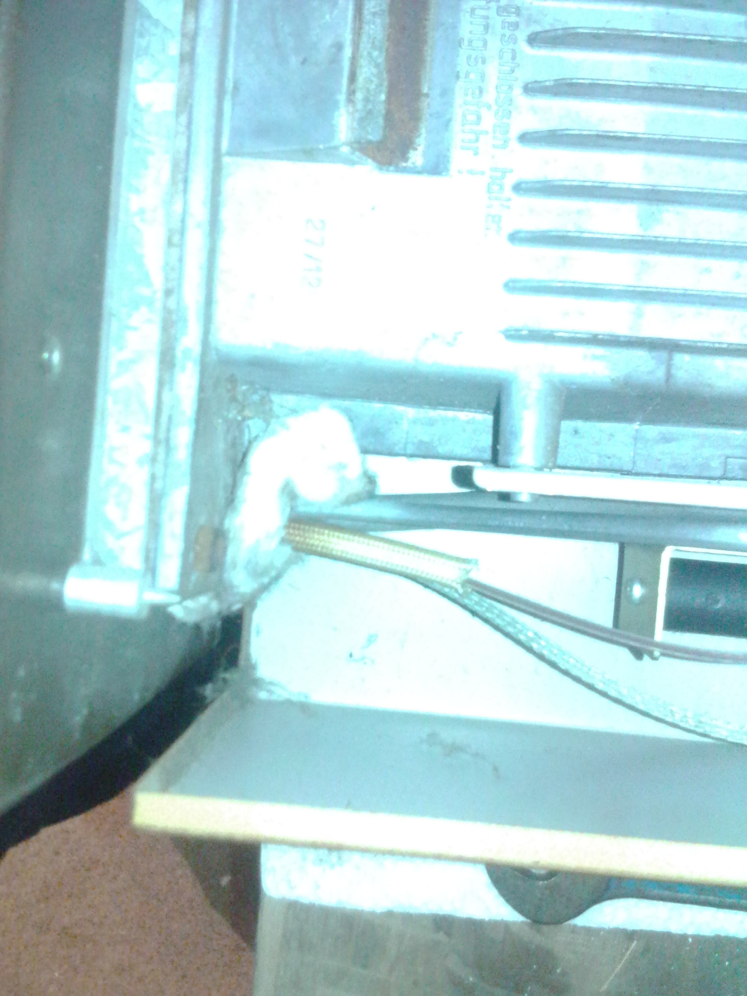 - otwór w podstawie pieca, przez który przechodzą rurki gazowe i kabelki od zapłonu/termopary, uszczelniony jest czymś w rodzaju waty (?) - czy to tak ma być czy ktoś upchał tam watę żeby nie ciągnęło zimnem? Nie wygląda to na rozwiązanie fabryczne, ale podejrzewam że po wyciągnięciu tejże waty nie będzie zachowana szczelność w tym otworze i spaliny wlezą do środka. załączam fotę tej "waty"