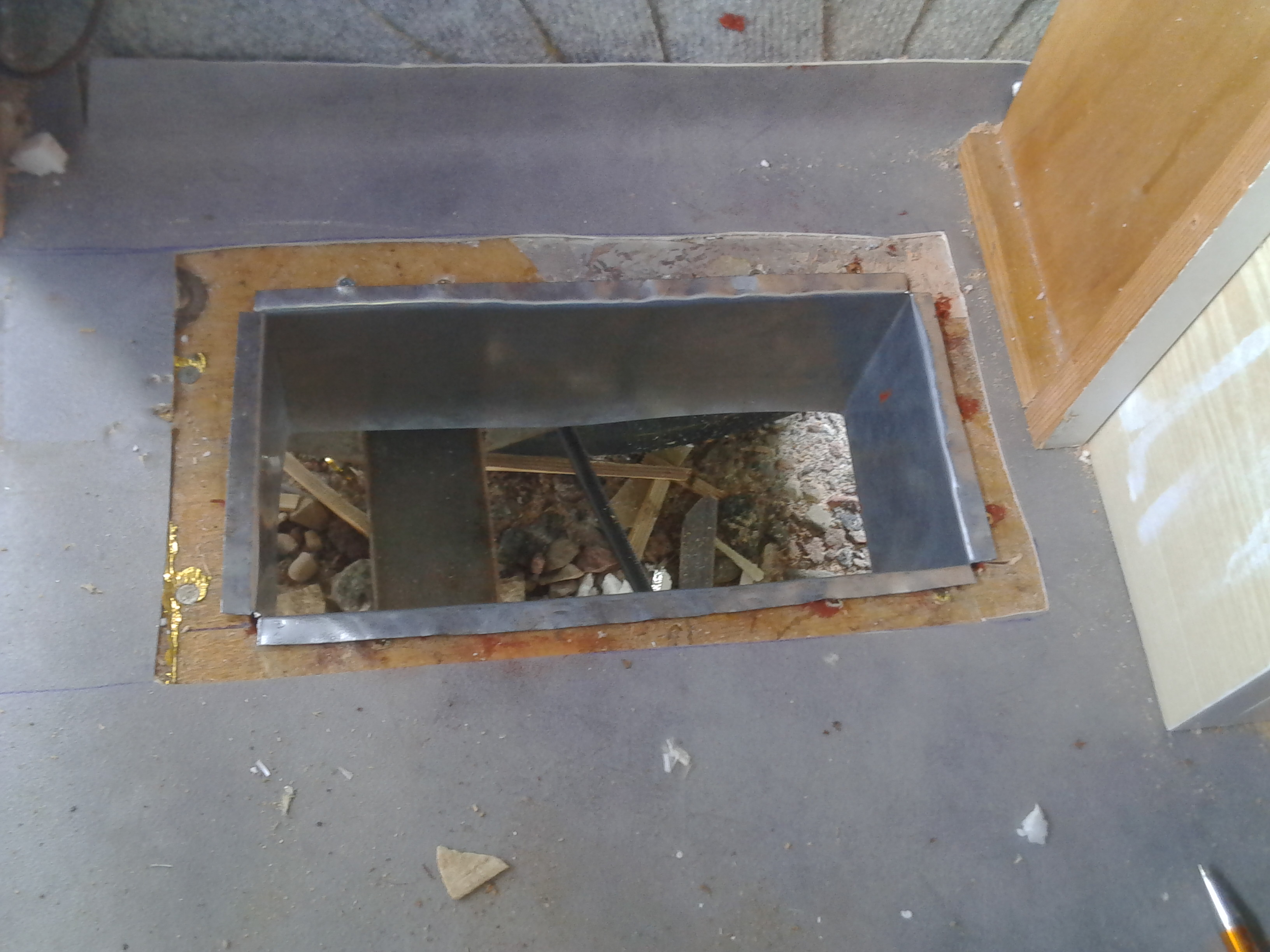 Zależało mi na tym, aby z racji dolnego wyrzutu spalin zabezpieczyć podłogę przed wniknięciem spalin między sklejkę a laminat. W tym celu wyciachałem nożykiem wokół otworu styropian, którym izolowałem podłogę, a w przerwę włożyłem wokół przycięte kawałki deski minimalnie niższe od przerwy. Deski zarówno od spodu jak i od góry posmarowałem silikonem wysokotemperaturowym.