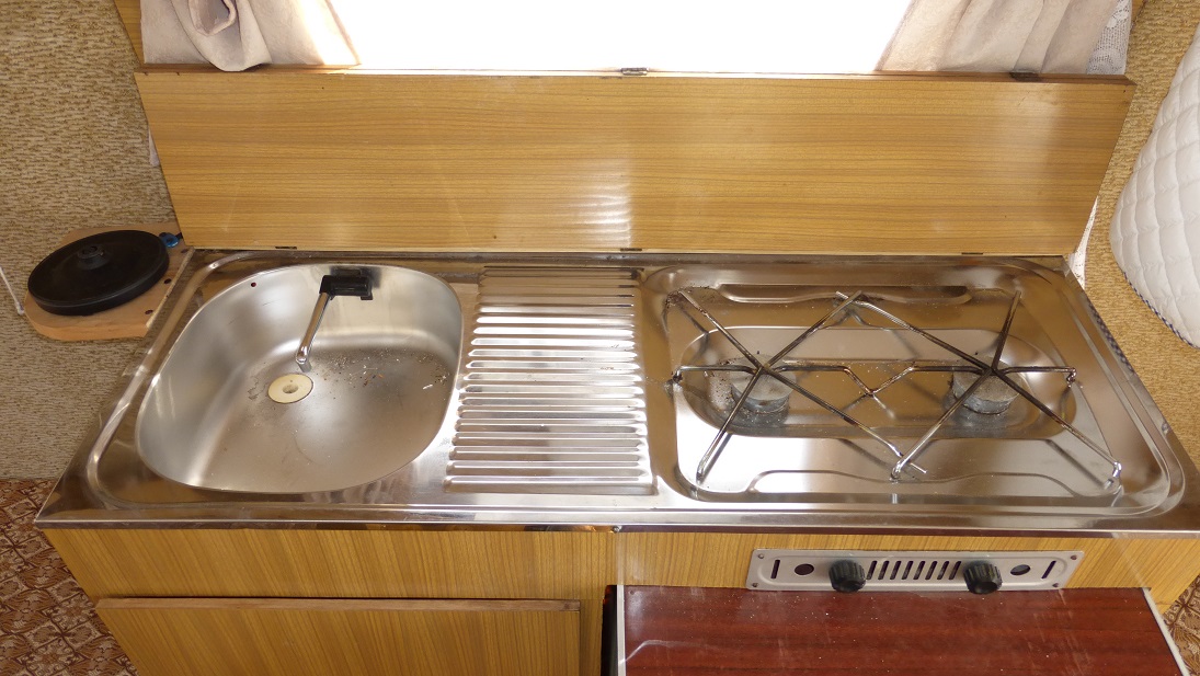 A więc N-132L rocznik 1985. Prawie w oryginale, poprzedni właściciel wymienił tylne lampy, gniazdo przyłączeniowe 230V i tyle. Z epoki są dołożone obok oryginalnych lampek jarzeniówki i duża lodówka. Wymieniono też tapicerkę przy okazji ocieplając przyczepę styropianem. Wygląda okropnie ale nieźle trzyma ciepło, są też wszystkie szyby podwójne. To co mi się podoba to płyta kuchenna Cramera. Kuchenki na razie lepiej nie odpalać ze względu na stare węże i reduktor a zlew nie ma podłączonej wody. Meble w paru miejscach się rozłażą i trzeba będzie je naprawić. Mimo, że nie będziemy robić kapitalnego remontu a raczej lifting pod swoje potrzeby, roboty będzie dużo. Chyba kupiliśmy dobrą bazę żeby zrobić wszystko po swojemu.
