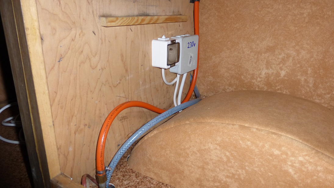 Wodę podłączyłem za pomocą zbrojonego węża igielitowego. Do tego nowa pompka i zaworek zwrotny. Trzeba było przerobić odpływ ze zlewu bo kolidował z lodówką. Na szybko zrobiłem go z plastikowej rurki pół cala i kolanek. Wydawało się, że jest szczelny ale na zapas skleiłem części poxipolem. Podczas wyjazdu odpływ nie zatkał się ani razu ani nie przeciekał więc zostanie tak jak jest. Lodówka ma swoje gniazdo w szafce kuchennej.