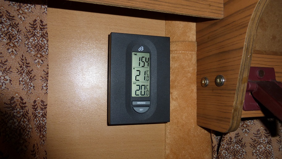 Na płycie okiennej, na prawo od okna kuchennego założyłem na stałe kupiony w Lidlu termometr elektroniczny. Fajny sprzęcik, pokazuje bieżącą temperaturę wewnątrz i na zewnątrz i zapamiętuje najmniejsze i największe ich dobowe wartości. Trochę zabawy było z przeciągnięciem cieniutkiego przewodu czujnika zewnętrznego pod przyczepę ale dało radę. Przepuściłem go za szafką kuchenną i przez otwór w podłodze którym idzie rurka gazu.
