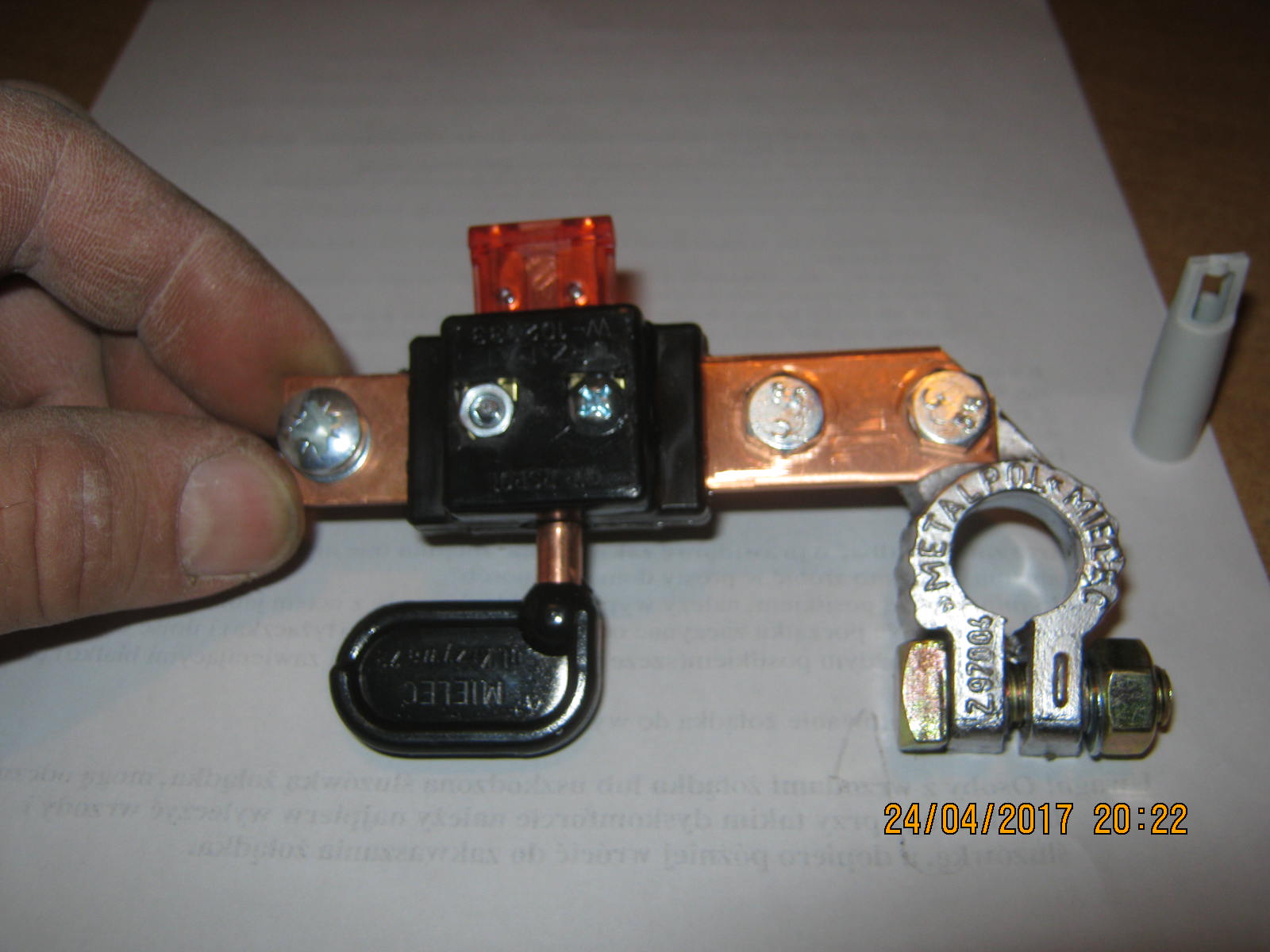 odcięcie prądu na masowym kablu z kluczykiem i bezpiecznikiem