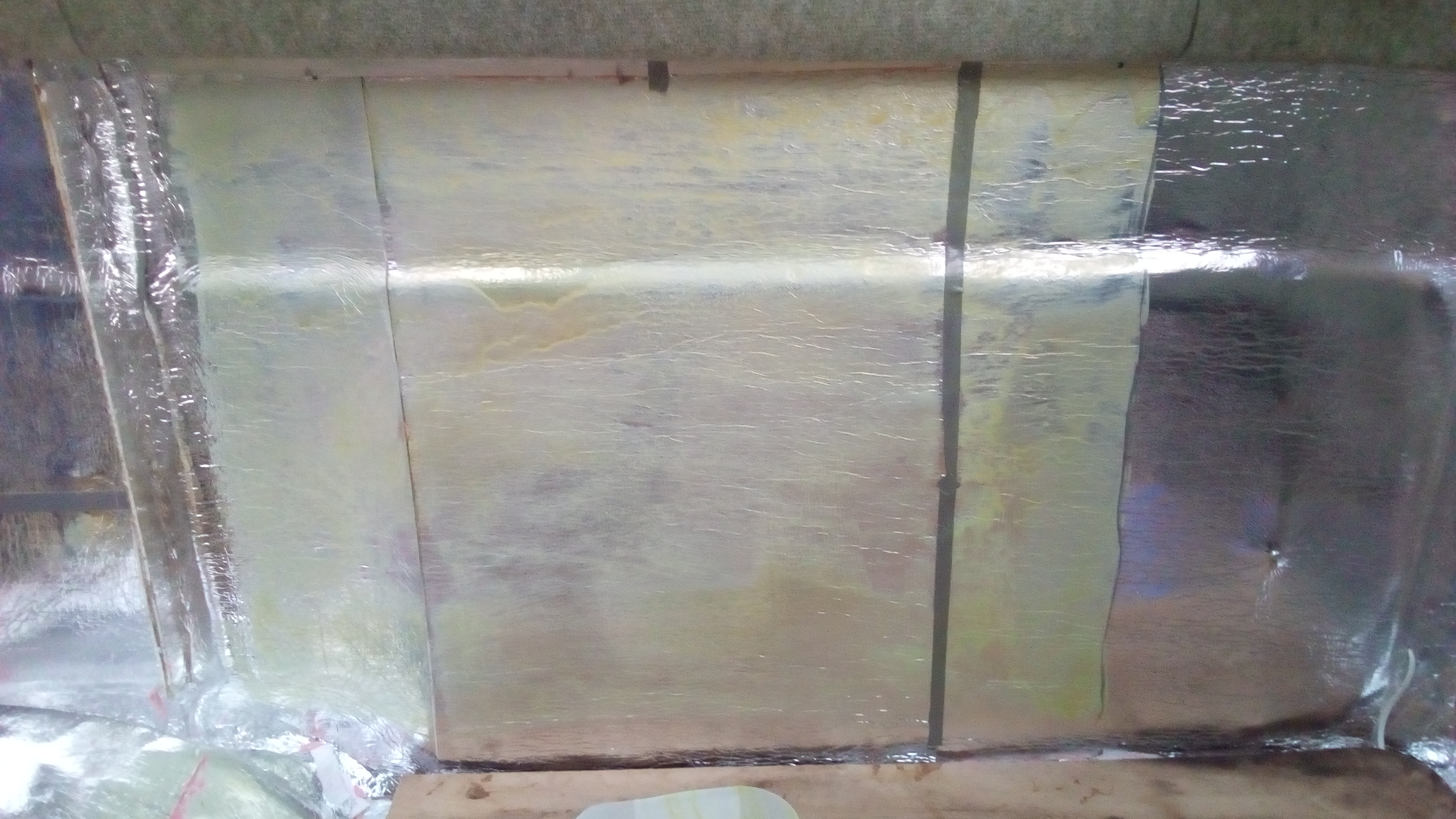 Sposób w jaki ja to robiłem, coby nie uwalić wszystkich brzegów klejem, zwłaszcza kiedy już mamy coś na ścianie wyklejone. Bok dłuższy przyczepki (w sensie ten bez drzwi) wykładzina była klejona jako cały kawałek. Przyłożyłem to do ściany tak jak miało by to przylegać ostatecznie i umocowałem do listwy drewnianej. Następnie podgiąłem dół do tej listwy i przymocowałem na zszywki. Czyli jak to na fotce widać, mam połowę odsłoniętą do posmarowania lepiszczem. Posmarowaną połówkę opuszczałem stopniowo, głaskając dociskałem do ściany. Po kilku minutach czy nastu opuszczałem górę, smarowałem i heja z klejem na ścianę.
