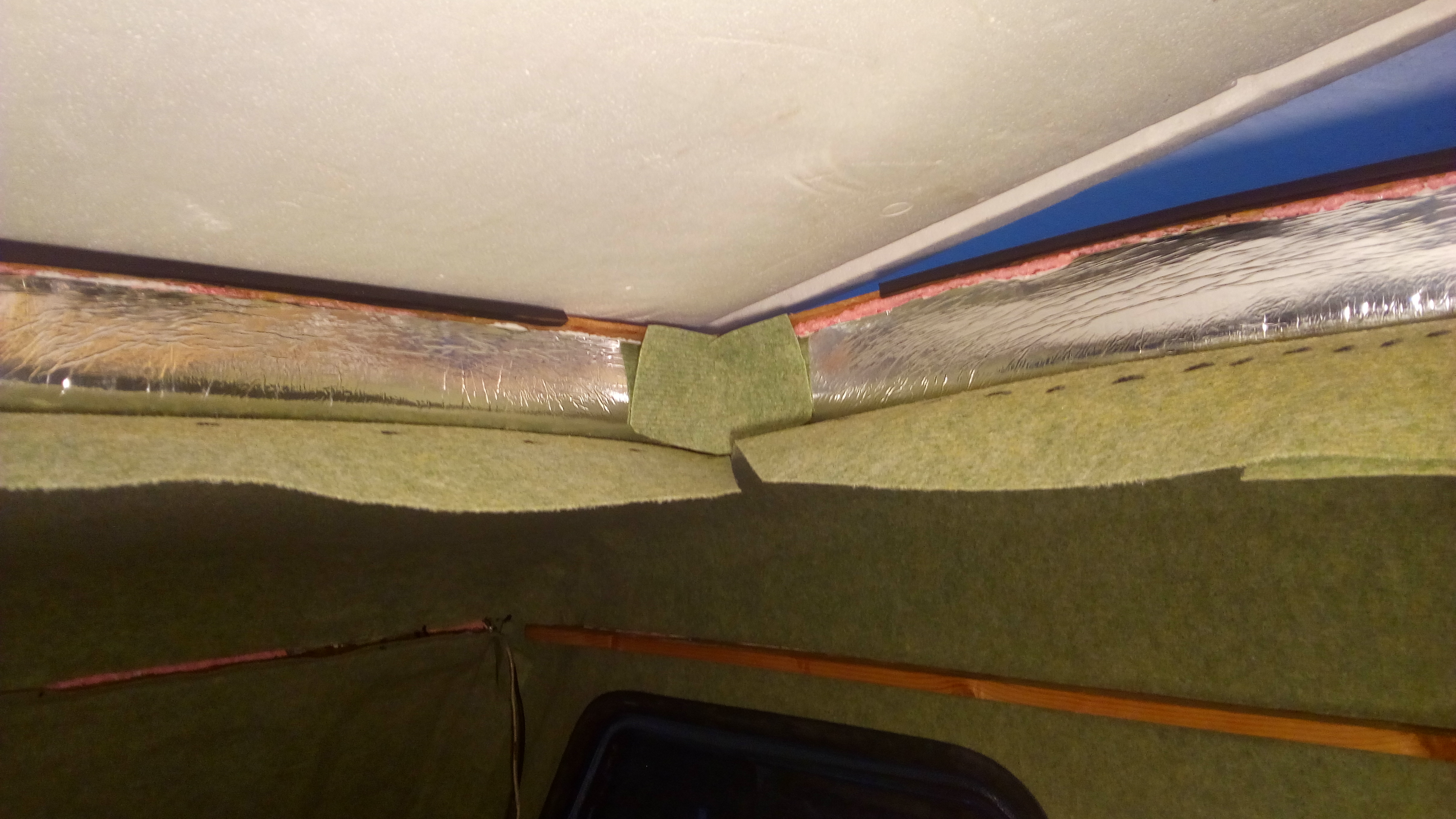 Wykładzina łączy się w pionie w narożnikach przyczepy i przy dachu na bananach. W jednym i drugim przypadku jest to zrobione na zakładkę ok 2 cm.
