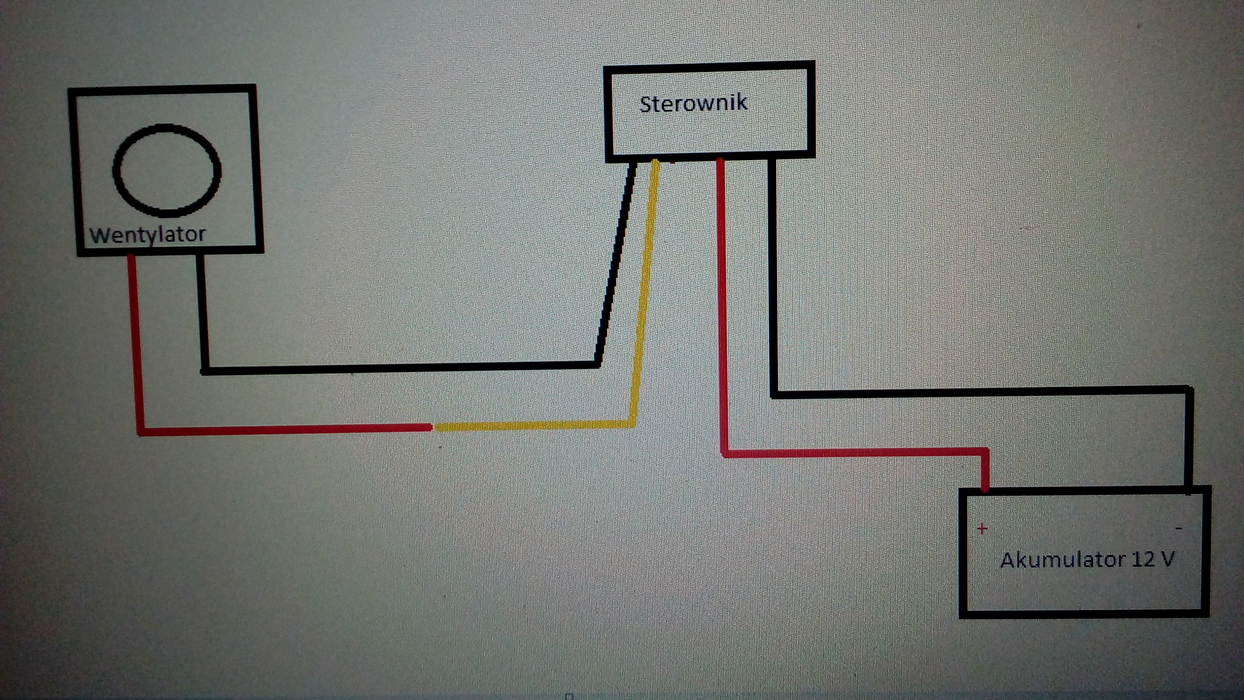 Urządzenie posiada wejście napięcia 12 V oznaczenie przewodów kolorami czarny czerwony ( czerwony plus a czarny minus i te przewody podpinamy pod akumulator 12 V ) Następne przewody, które wychodzą z urządzenia to przewody o kolorach czarny ( minus do wiatraczka ) oraz kolor żółty i ten przewód podpinamy do przewodu czerwonego z wiatraczka )