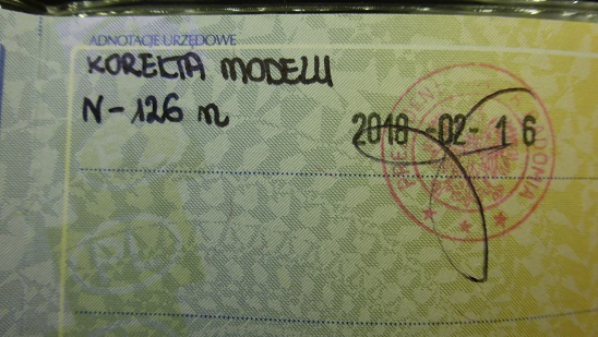 Wszystko udekorowane pieczęcią, jak to ma miejsce gdy wpisujemy hak czy lpg. Literek nie mogą wklepać w systemie normalnie w nazwie, nie przechodzi nic prócz "N-126" więc trzeba było zrobić ręczną adnotację. Papier przyjmuje wszystko więc to jest jedyna opcja żeby mieć w dowodzie nazwę faktyczną.