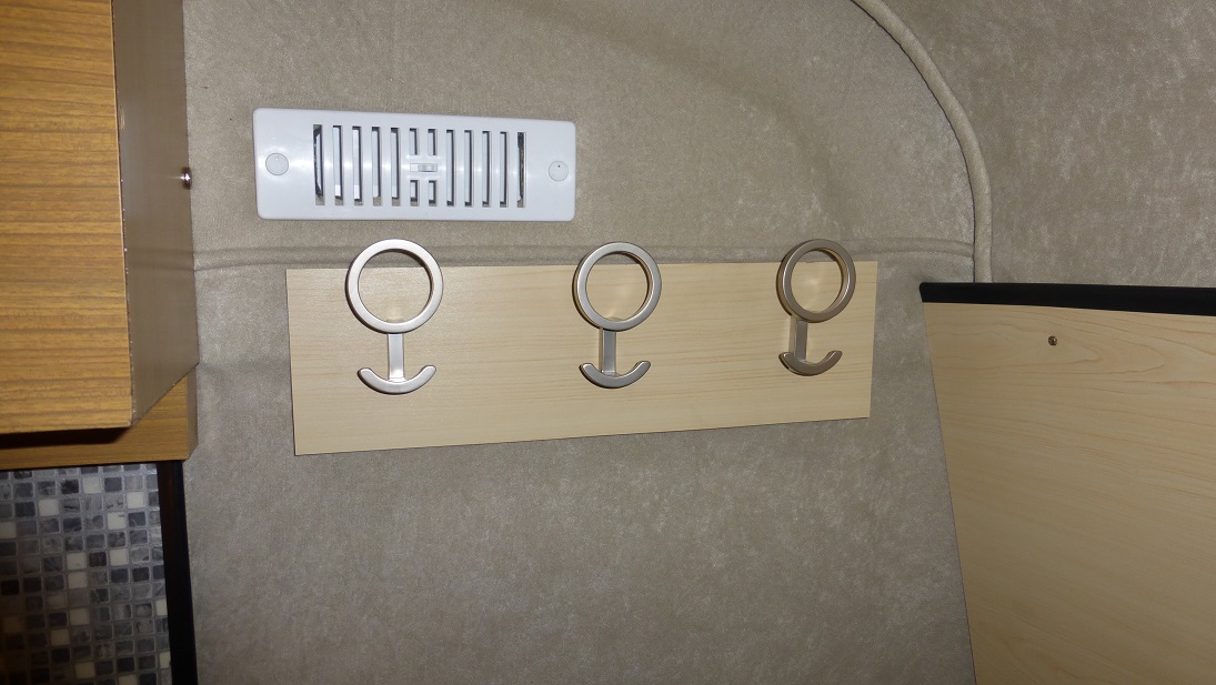 Dorobiłem też coś czego zawsze brakowało mi w przyczepie. Mowa o wieszakach na ścianie. Zrobiłem dwa zestawy wieszaków, jeden po lewej a drugi po prawej stronie przyczepy.