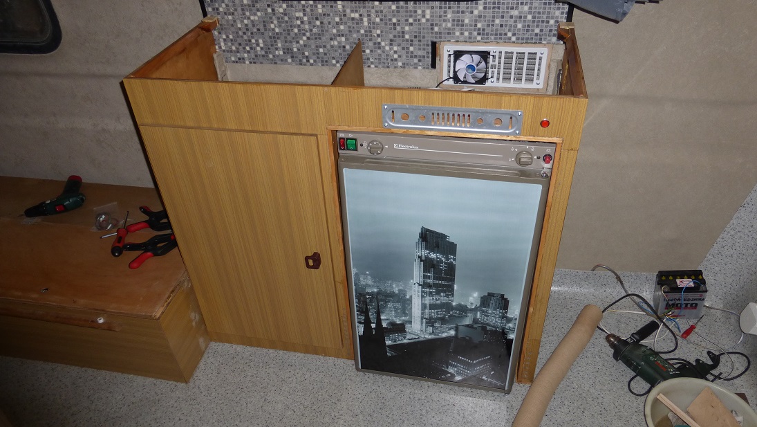 Pierwsza przymiarka lodówki do szafki kuchennej. Pasuje nieźle, ideału się nie spodziewałem po tej reanimowanej szafce. Tutaj również widać czerwony guziczek, lodówka a jak dobrze pójdzie także kuchenka będą odpalane za pomocą identycznego iskrownika jak piec.