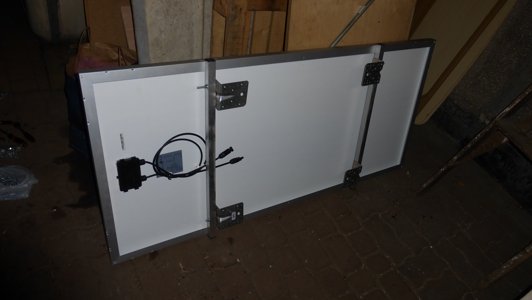 Było z tym sporo roboty, głównie z równym ustawieniem panelu na przyczepie. Czynność wydaje się łatwa ale wbrew pozorom nie jest tak kolorowo. Mam to utrudnienie, że nie dysponuję przestrzenią po bokach przyczepy większą niż wystarczy aby się przecisnąć więc trudno było manipulować solarem. Montaż we dwóch, jeden miał komfort korzystania z drabiny, drugiemu za drabinę robiła stojąca pionowo obok "wieloryba", rama od "zapiekanki"