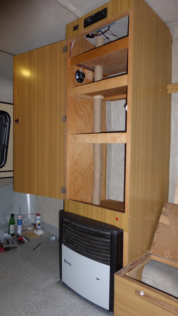 A tutaj już w szafie. Pierwsza od góry to półka oryginalna którą muszę jeszcze pomalować, dwie następne dorobione. Półka najniższa, nad piecem też była dorabiana. Nie przykręcam jej, będzie podnoszona ale bez zawiasów. Jakiś dostęp serwisowy za piec musi być. Muszę też wykombinować jakieś osłonki na głośniki.