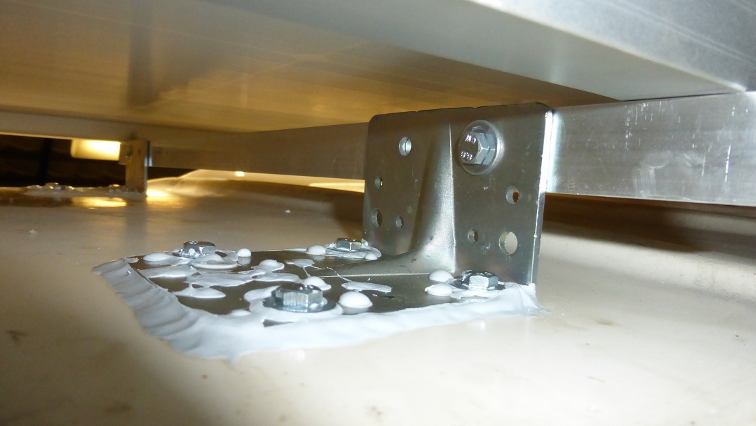 Kątowniki przytwierdzone są na cztery śruby M6x16mm każdy i uszczelnione uszczelniaczem Soudaflex. Nie wygląda to zbyt apetycznie ale tam nikt nie zagląda.