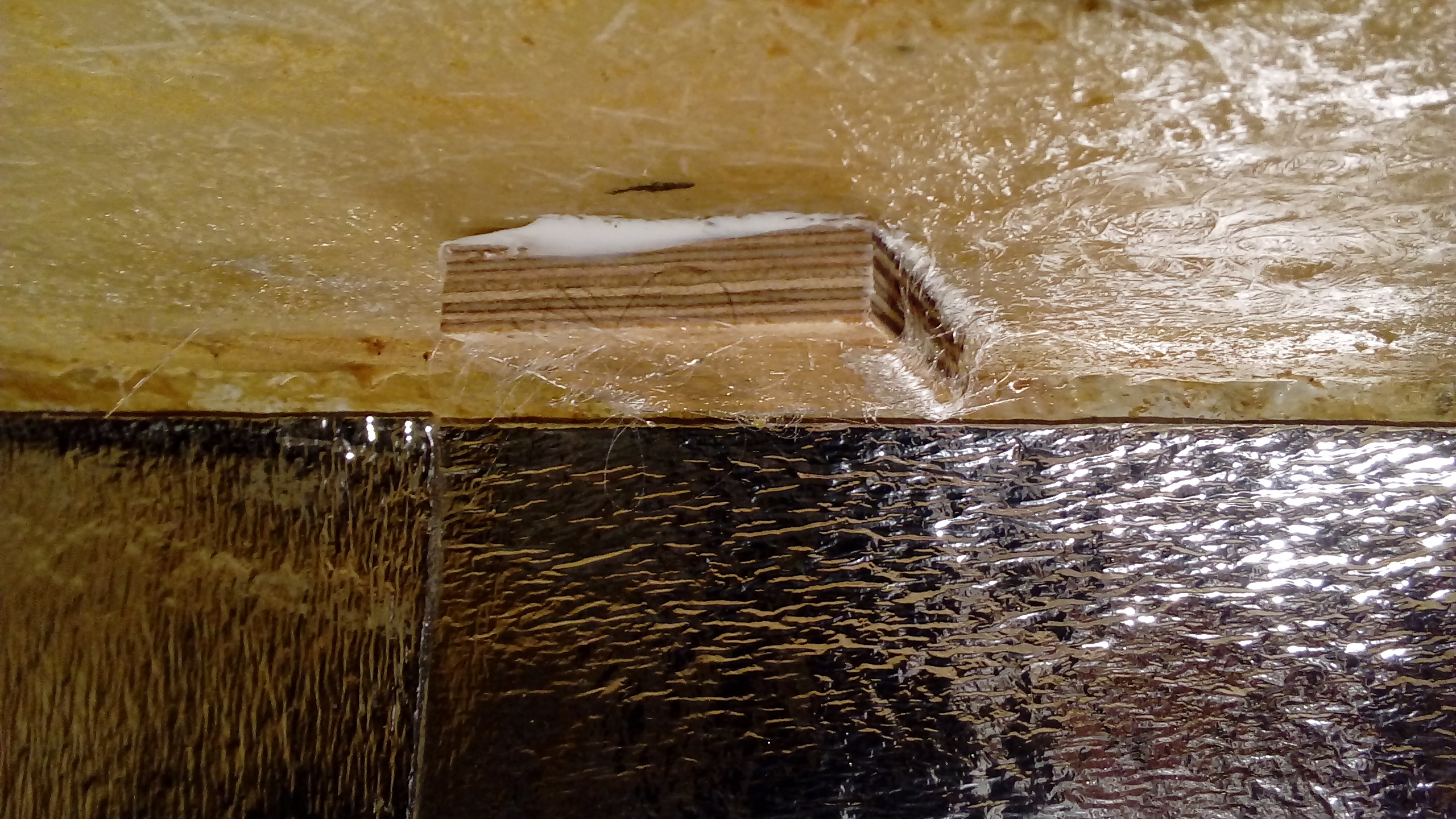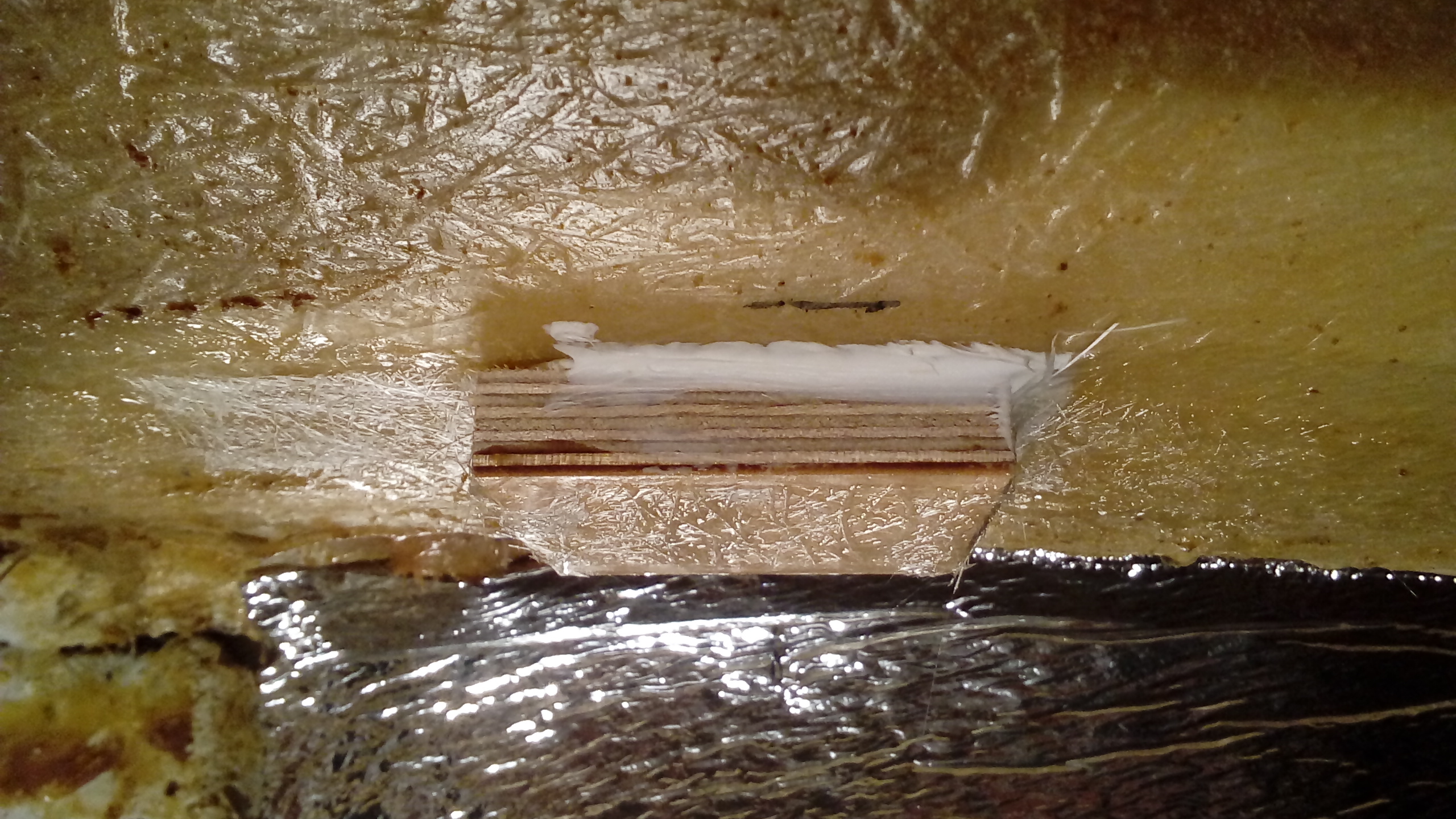 Takich wklejonych w sufit drewnianych klocków jest około 18 sztuk i wszystkie już zalaminowane żywicą i tkaniną szklaną.