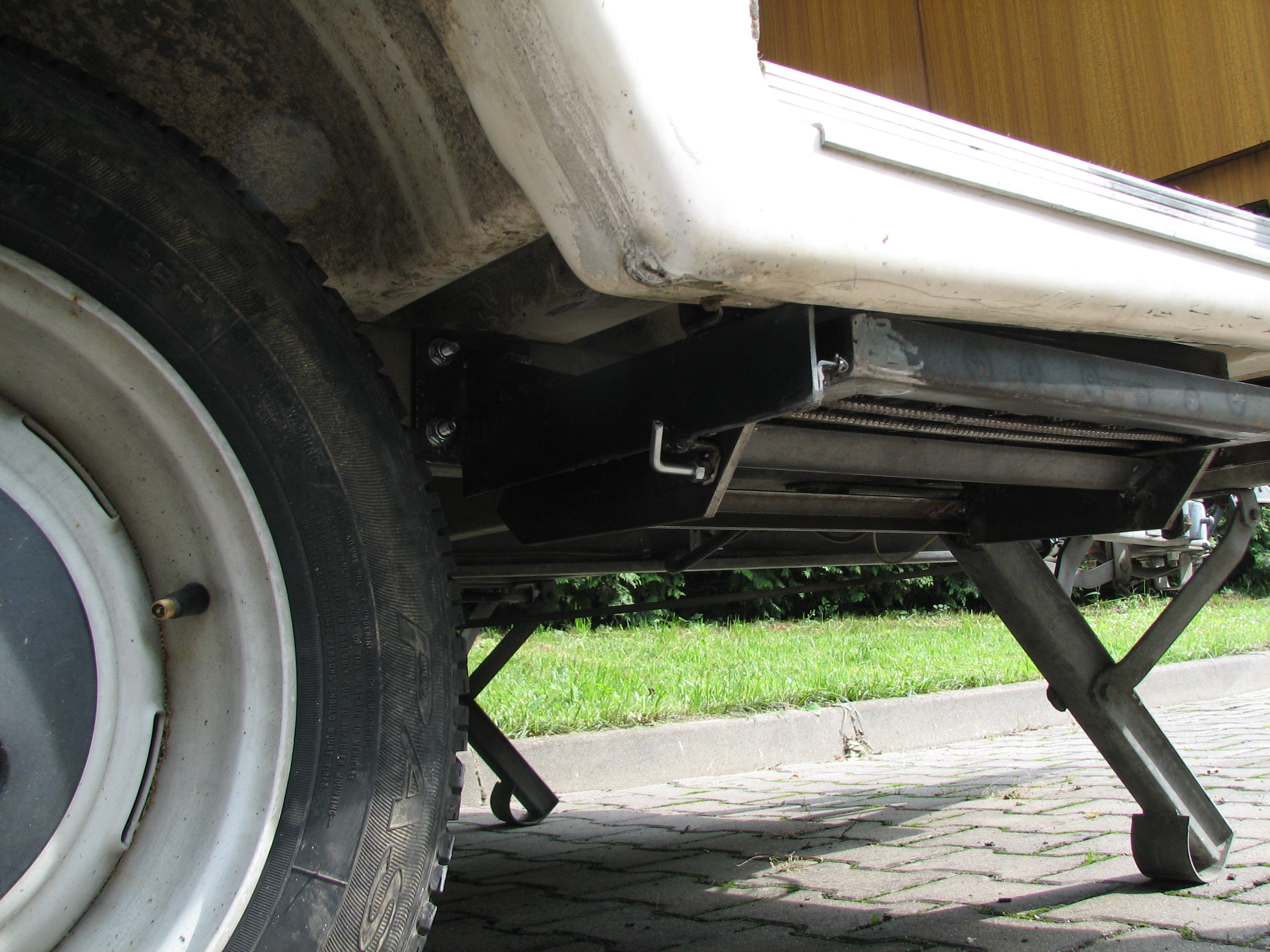 Dzięki obrotowemu stopniowi zmniejszyła się wysokość schodka po złożeniu.Tak wygląda złożony schodek pod przyczepą: