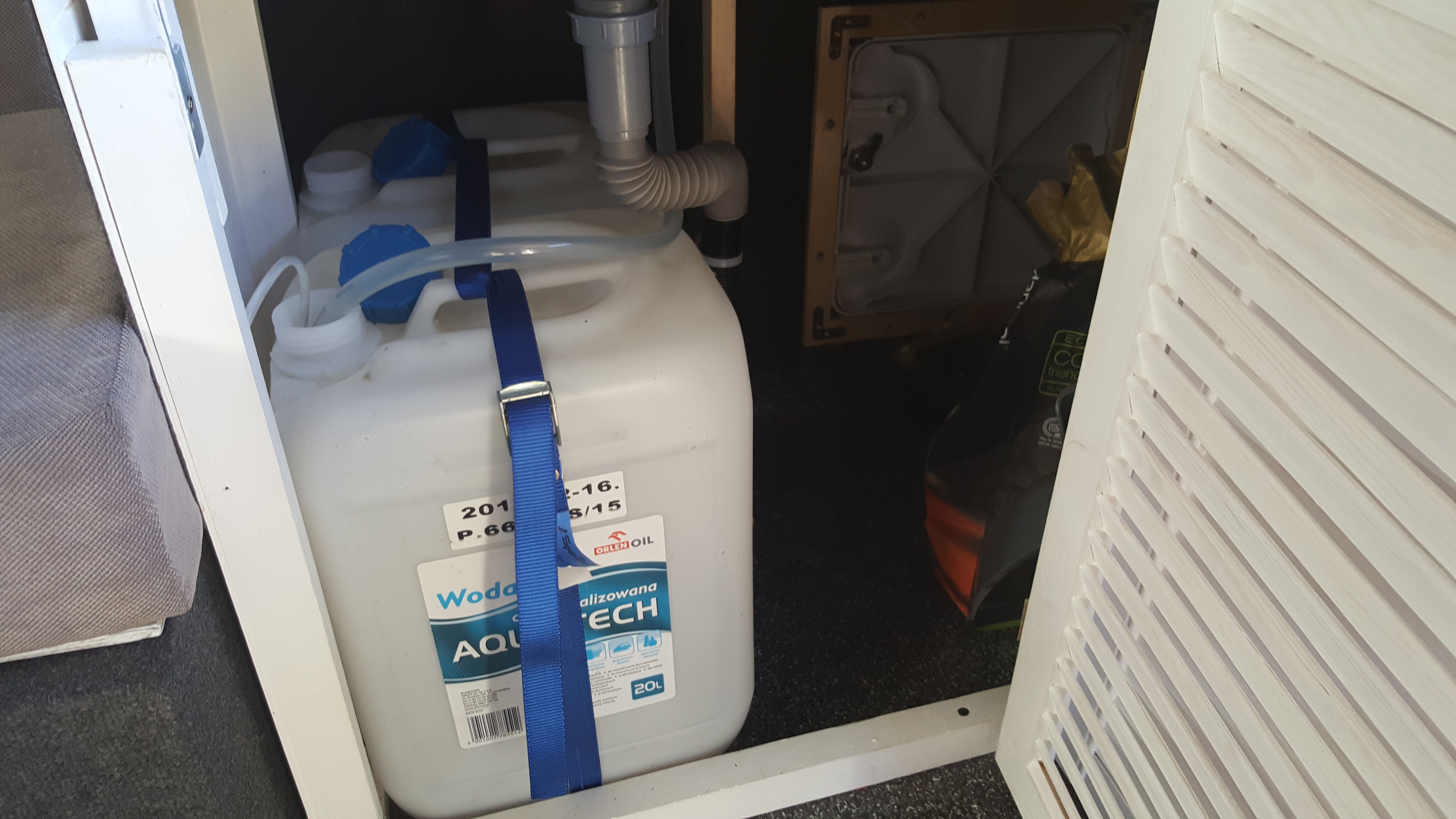 Pod zlewem dwa pojemniki po 20l, szafka jest narożna dlatego zmontowałem od zewnątrz luk aby można było wygodnie obsługiwać tą przestrzeń: