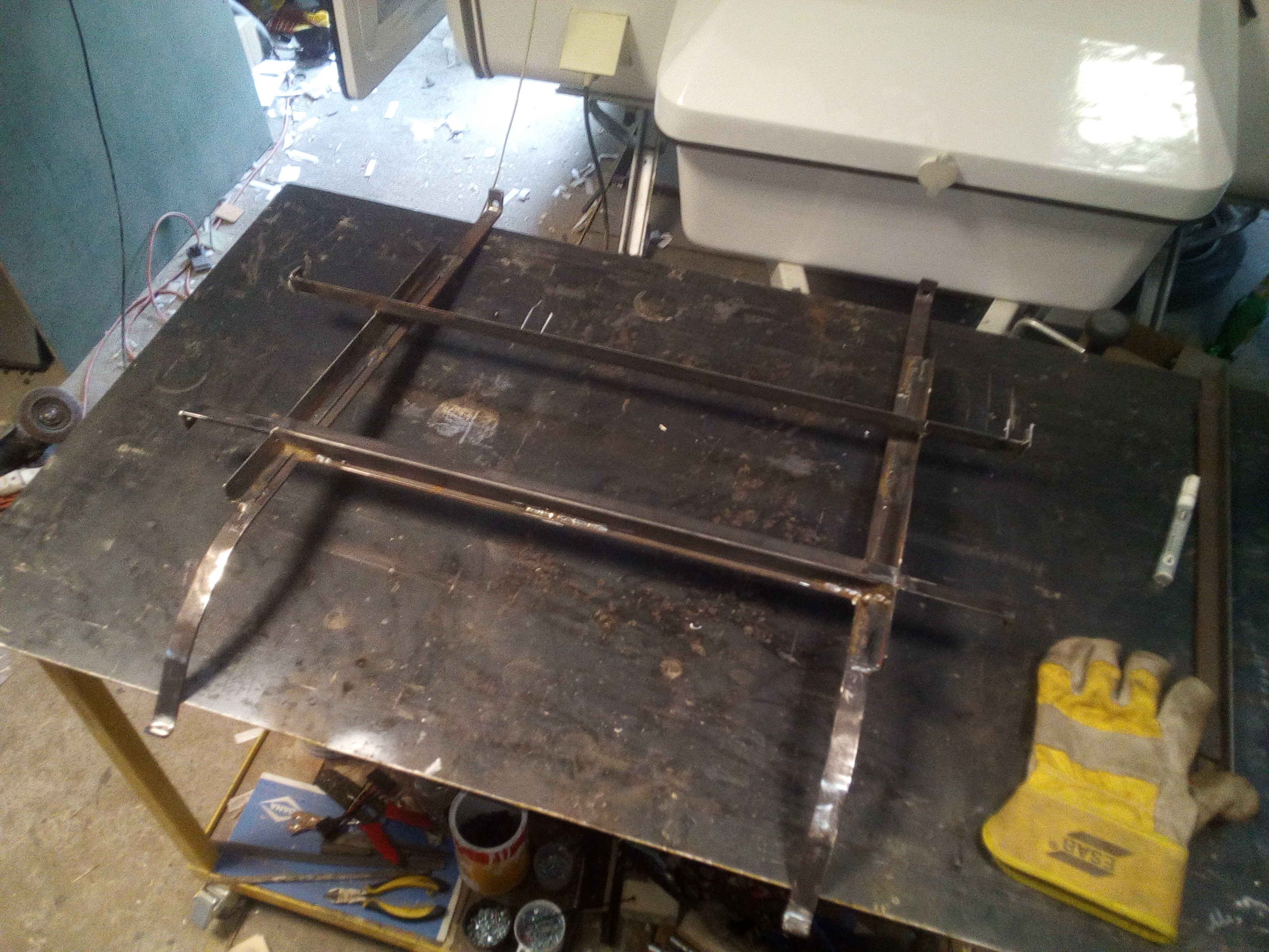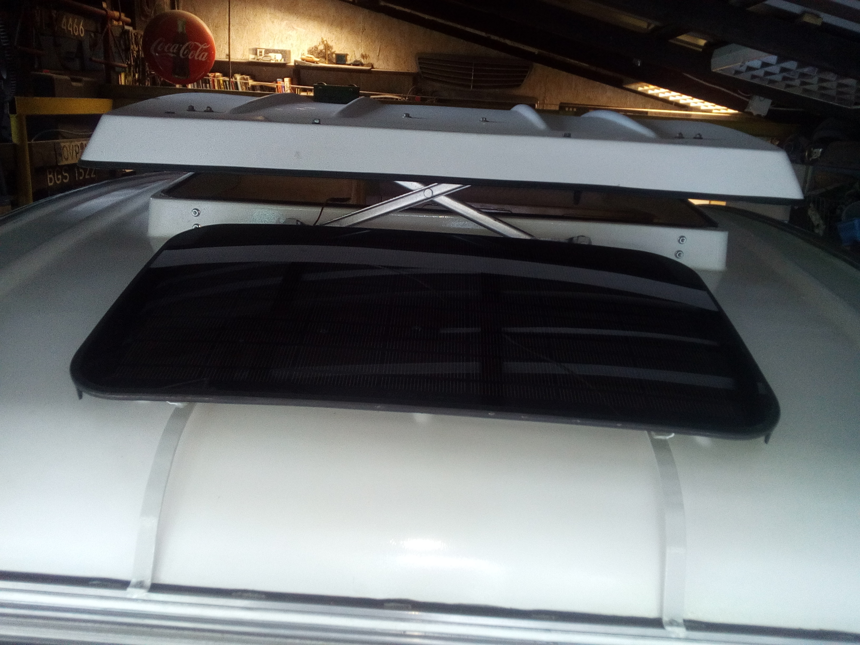 i stwierdziłem że tyle tego że solar dam na dachu, wykonałem taki stelaż wbrew pozorom lekki i co najważniejsze bez ingerencji w budkę a na to dokręciłem ogniwo fotowoltaniczne z szyber dachu audi w pełnym słoneczku daje 16v damy jakiś regulator napięcia i doładowania aku w sam raz