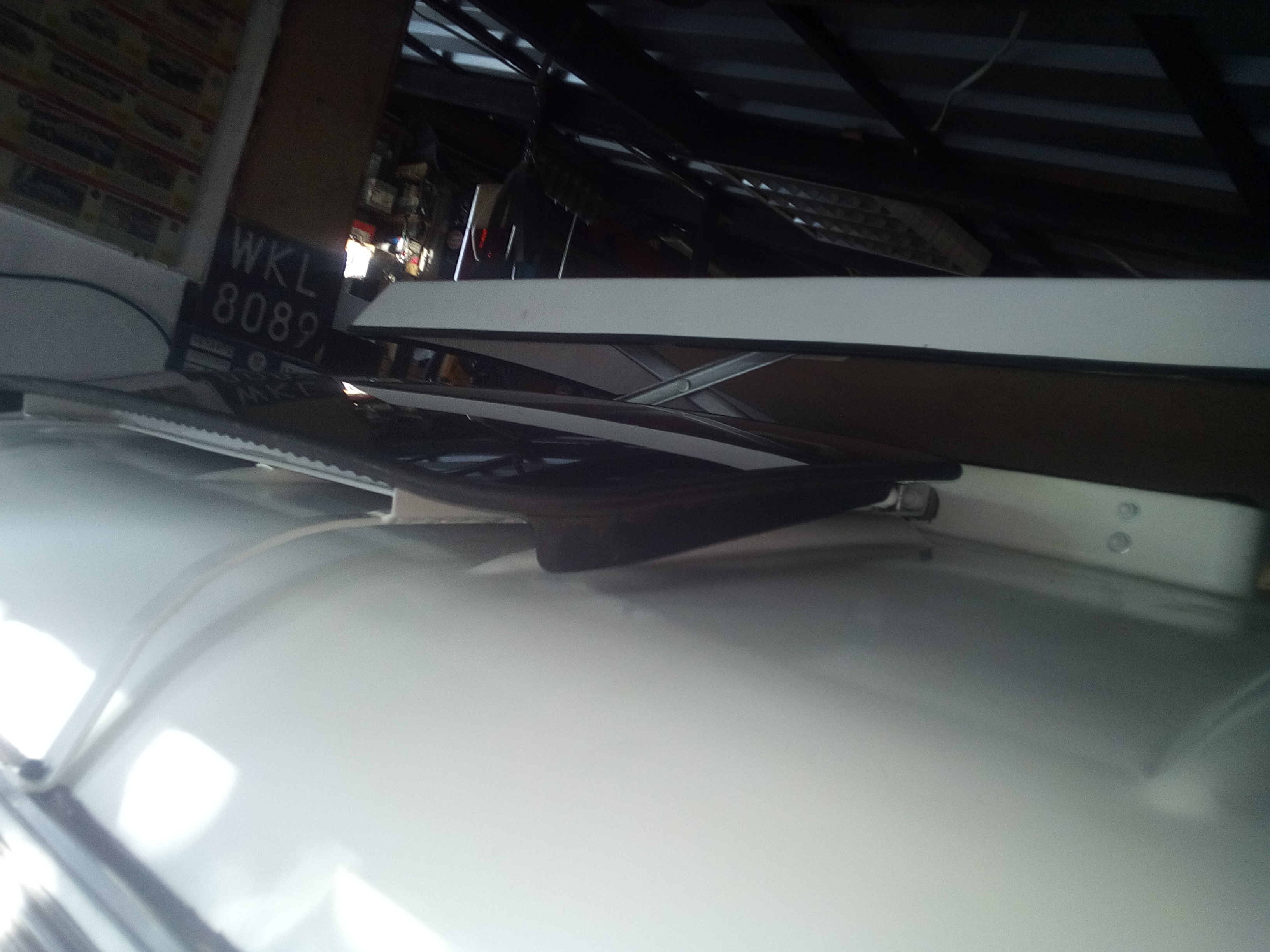 i stwierdziłem że tyle tego że solar dam na dachu, wykonałem taki stelaż wbrew pozorom lekki i co najważniejsze bez ingerencji w budkę a na to dokręciłem ogniwo fotowoltaniczne z szyber dachu audi w pełnym słoneczku daje 16v damy jakiś regulator napięcia i doładowania aku w sam raz