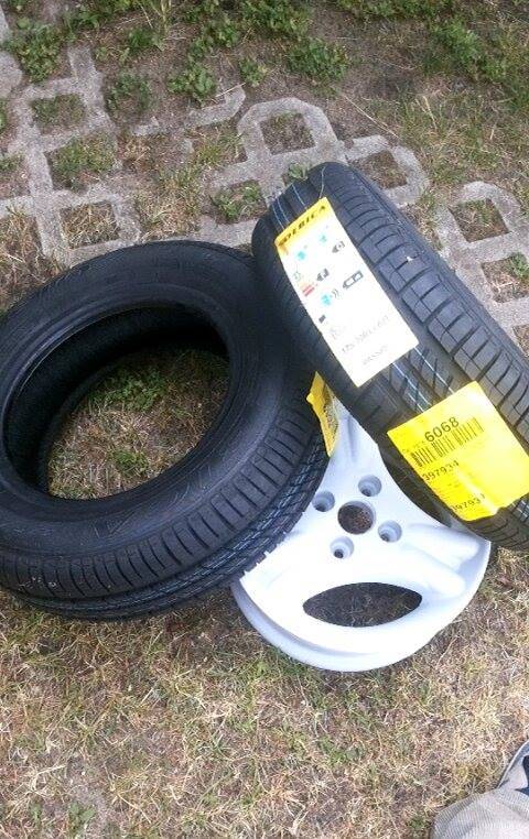 Zakupiłem też oponki, wybór padł na Dębica Passio 2 175/70 R13 82 T. Wyszło całkiem niedrogo ale zwracałem szczególnie uwagę na nośność, 475 kg na oponę tak wiec jest z zapasem