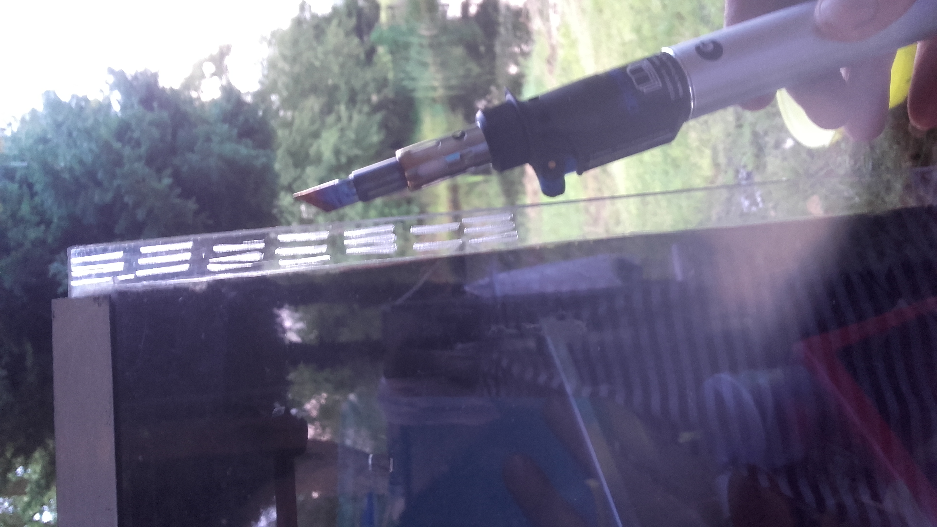 Zanim przykleiłem szyby do listew to wytopiłem w poliwęglanie płytkie zagłębienia wzdłuż krawędzi która miała być klejona. Chodziło o to by klej miał się do czego przyczepić.