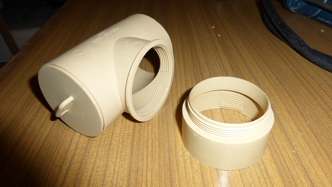 Rura do wylotu z boku szafy i do wylotu na dwór wchodzi w klapę na ścianie budy za pomocą takiego trójnika z zaślepionym jednym wyjściem: