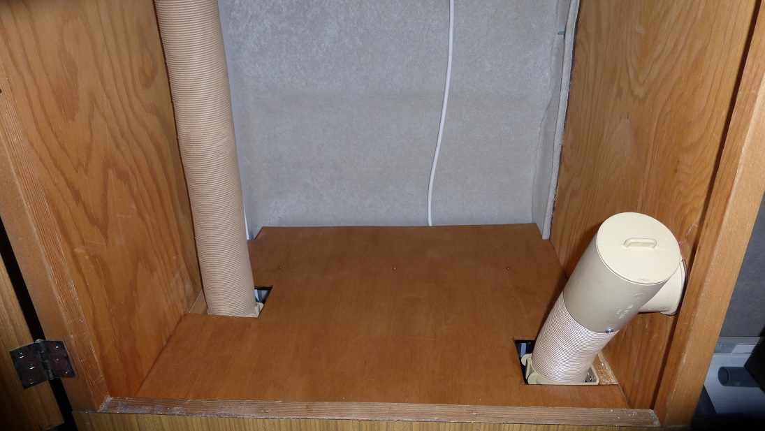 Jak widać na zdjęciu zrobiłem jeden wylot na dole przy drzwiach wejściowych a drugi w niecodziennym miejscu - na bocznej ścianie szafy żeby wiało nad powierzchnię łóżka.