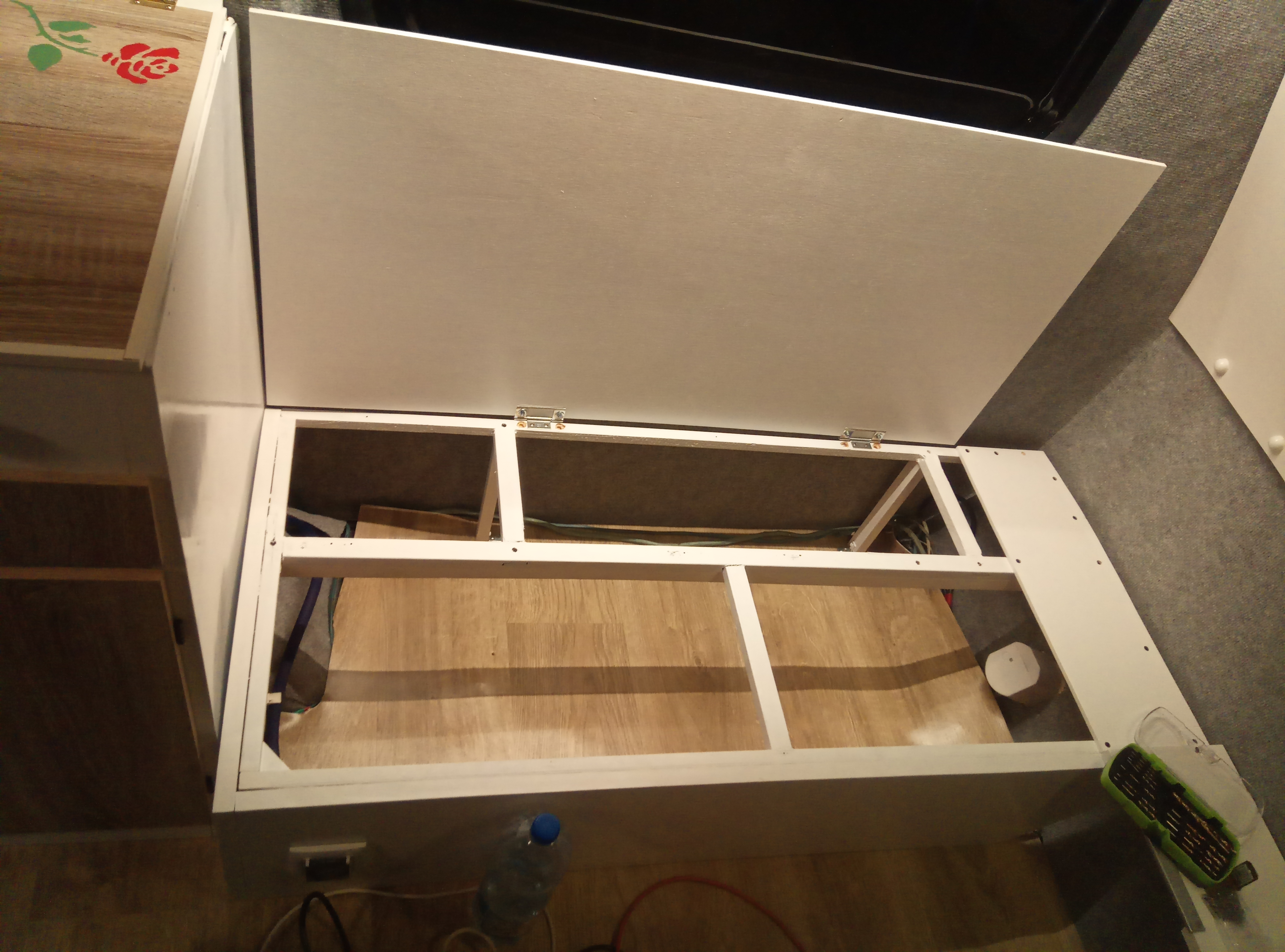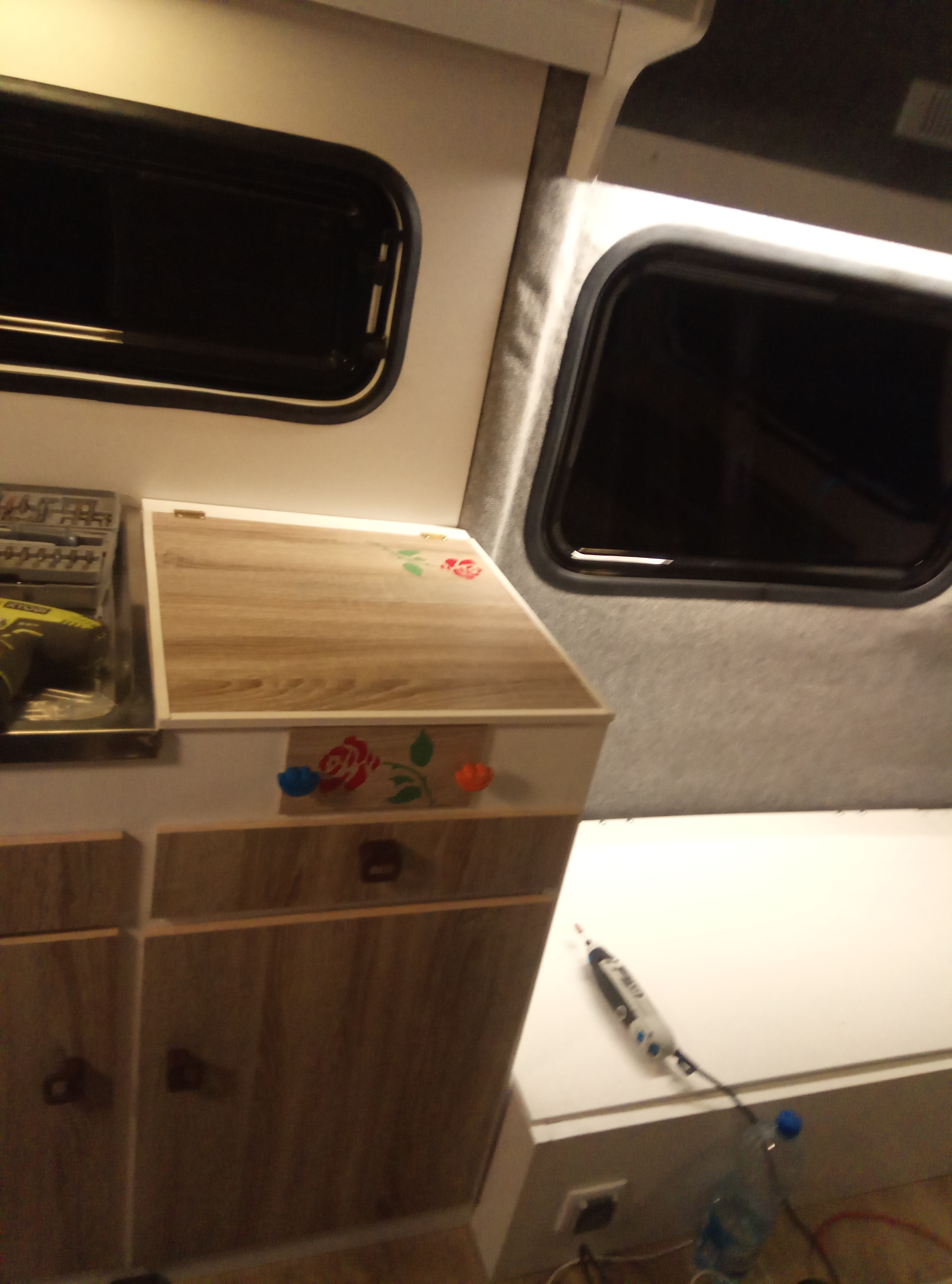 Stelaż został, tylko wzmocniłem. Docelowo wlatuje inne łóżko. Na razie pełny otwierany blat celem lepszego dostępu. Okleina chyba dąb sonoma, ale nie wiem pewno. Poprzedni właściciel nam kupował. Fajnie że się podoba. Teraz tylko fronty szafek i rolety i finito w środku. Później adaptery podpór i na ogólnopolski będzie ok.
