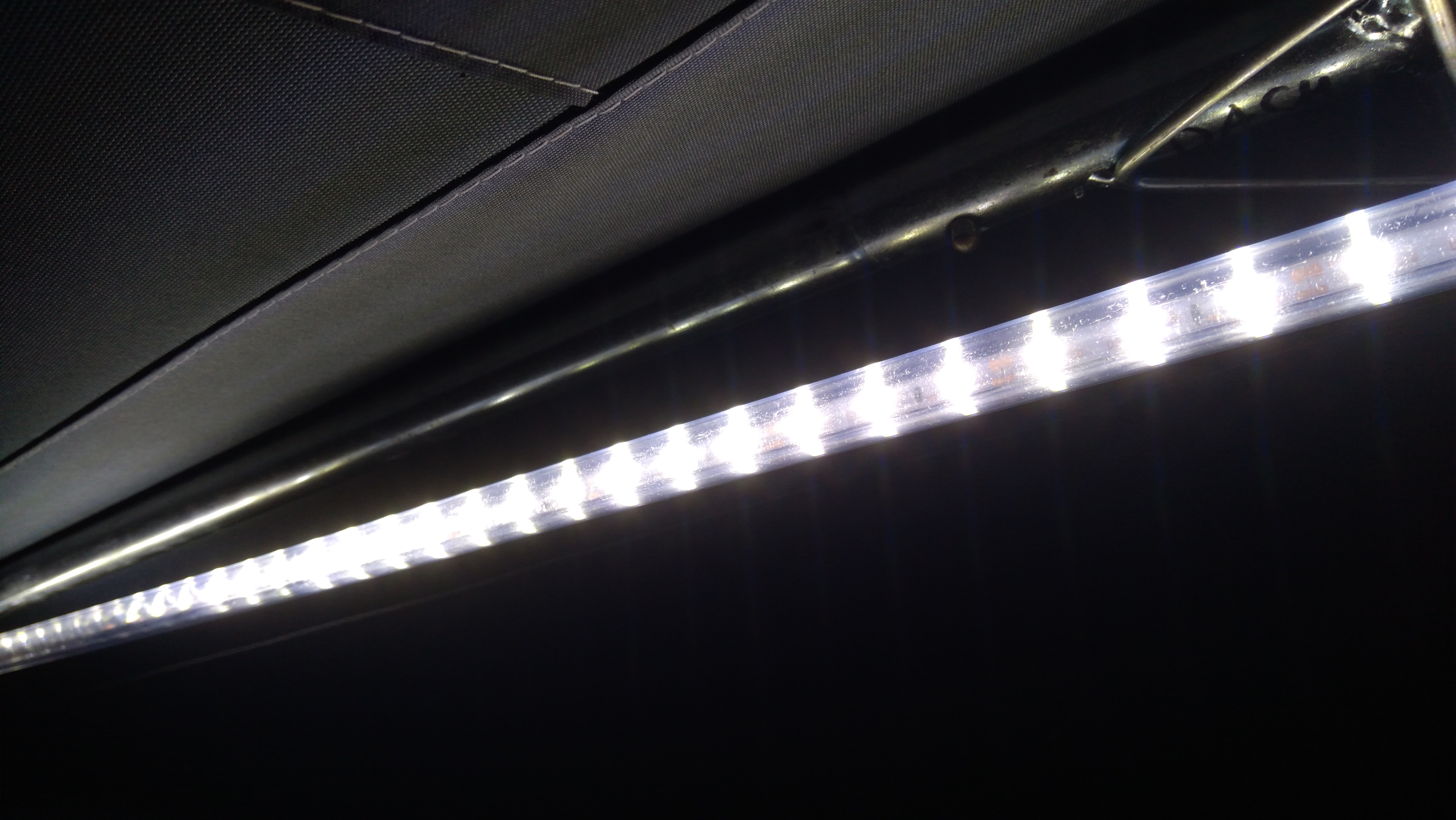 Pomysł chyba niezły. Inspiracją były węże LED i taśmy LED oplatane wokół rurek daszka i przedsionka. Pomysł o tyle fajny, że montaż i demontaż zajmie chwilkę i jest niezależny od rodzaju zadaszenia (daszek/przedsionek). Obudowa z profili PVC i korki z odrobiną sikaflexu gwarantuje szczelność i odporność na warunki pogodowe a jednocześnie ochronę taśmy LED. Po zdemontowaniu można bezpiecznie spakować do bakisty.