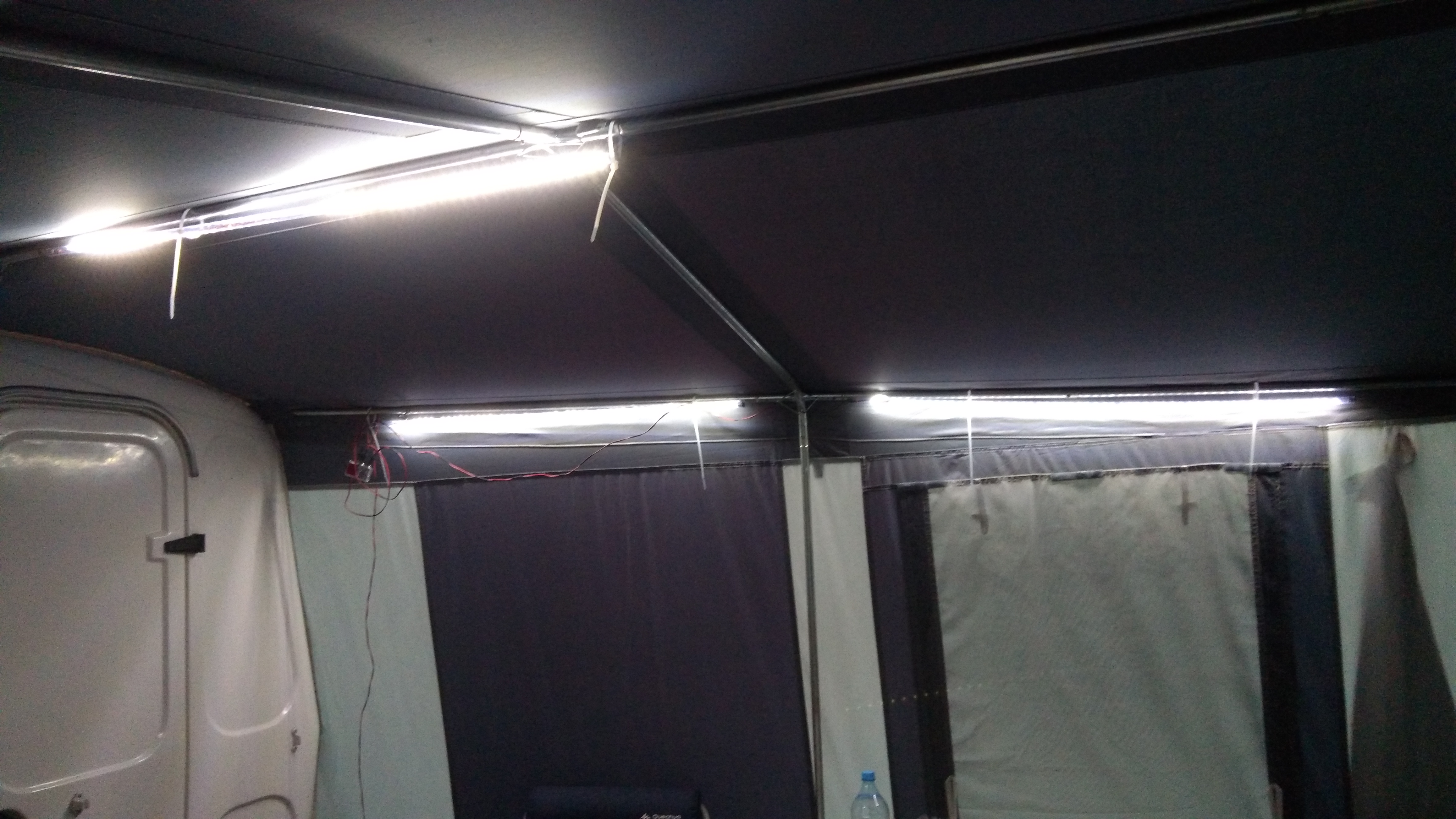 Naprędce przed wyjazdem na urlop zmajstrowałem sobie takie oświetlenie przedsionka. Lampa LED, którą jakiś czas temu zainstalowałem na ścianie obok drzwi pomimo fajnego mocnego światła jest dość irytująca przy wieczornych nasiadówkach w przedsionku ze względu na intensywny strumień światła skierowany poziomo w bok przyczepy i osoby siedzące twarzą do budy mają kiepsko. Często zakrywamy folią alu część lampy aby skierować strumień na podłogę.
