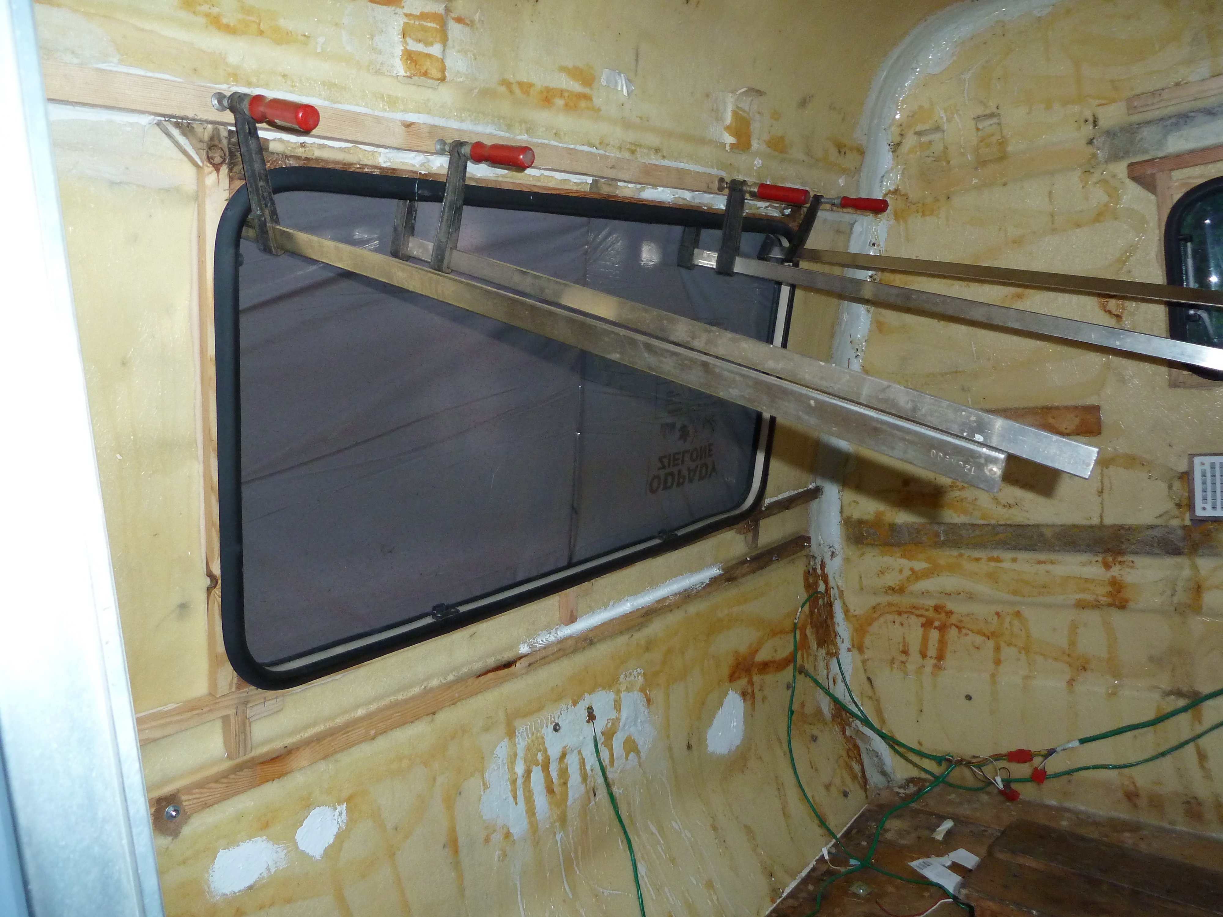 Tapicerka trafiła w kolorze miodowym, płyty okienne w kolorze buk w całości, nie dzielone jak to było fabrycznie. Wlaminowane zostały dodtkowe listwy pionowo pomiędzy oknami a ścianą boczną, płyta do tych listew została przyklejona na K+D aby pod wpływem wilgoci nie deformowała się za szybko. To samo robiłem w drugiej przyczepie.