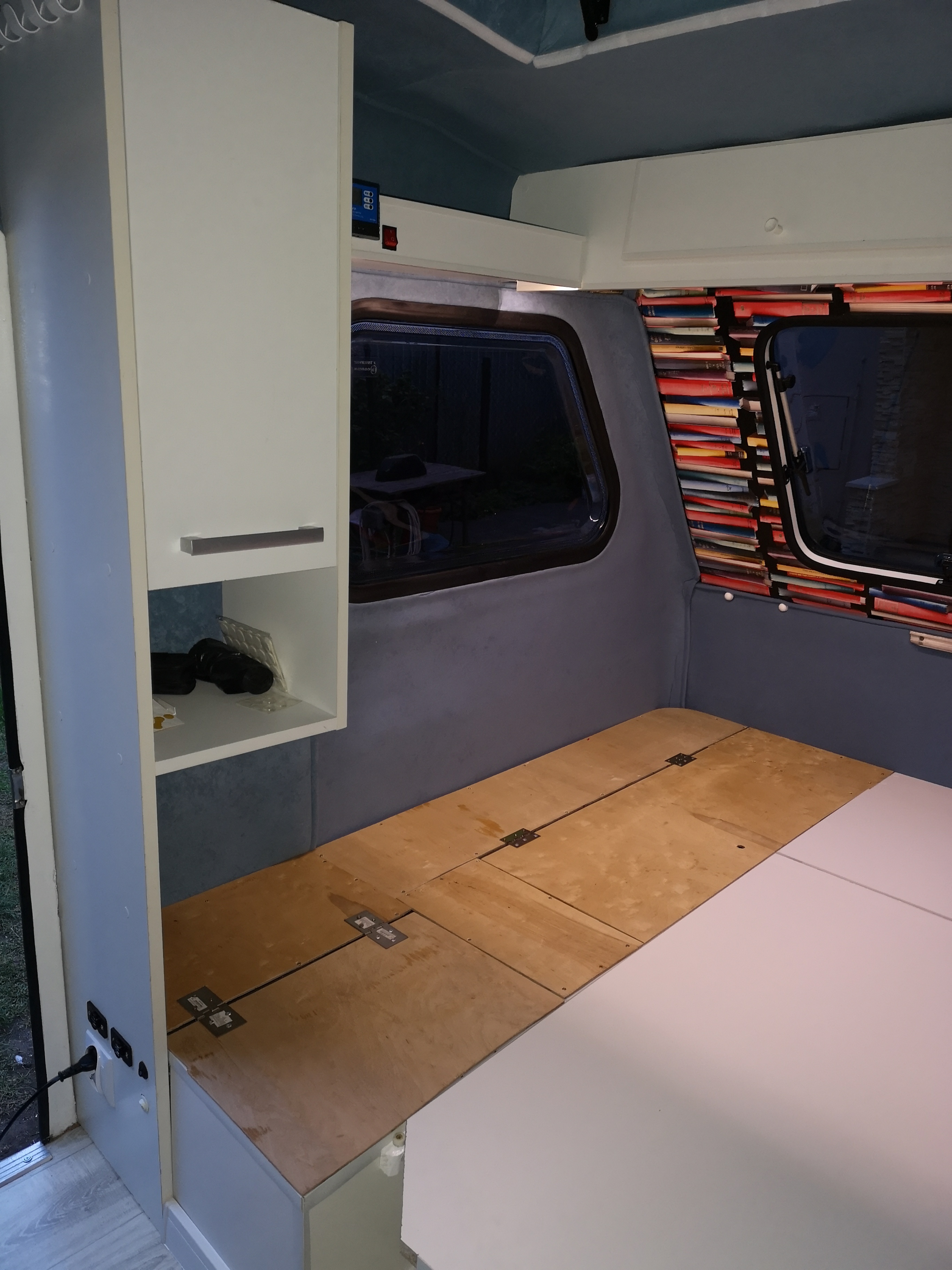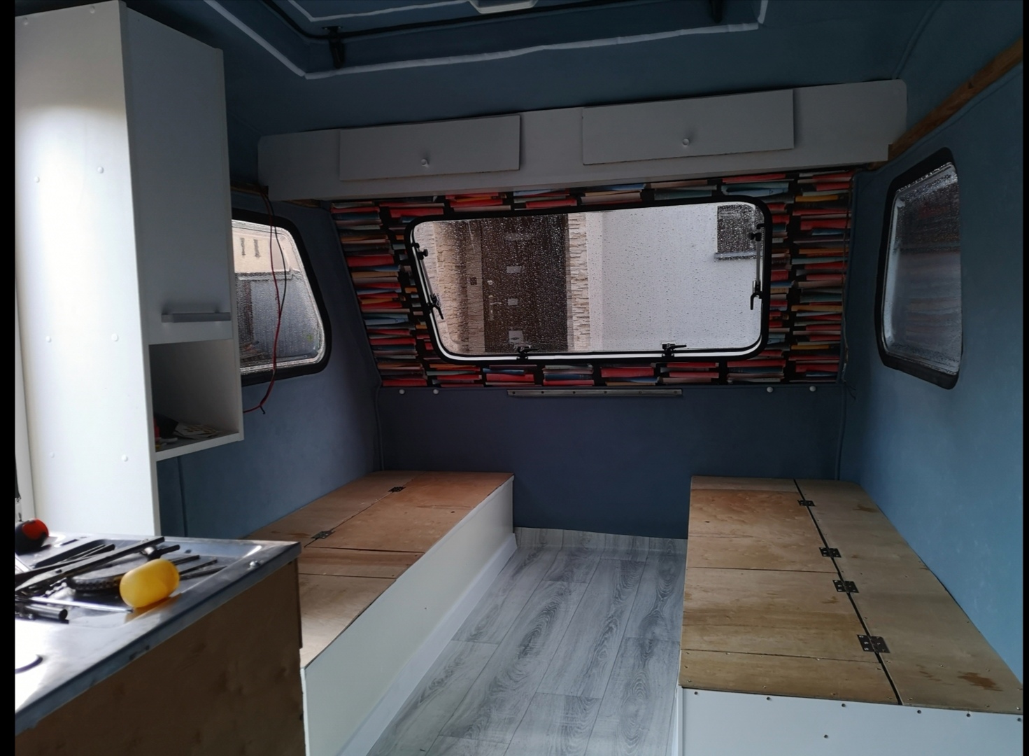 Zrobiłem półkę nad tylnym oknem (30cm głębokości), dwie kanapy, instalację 230v, na drzwiach kosz i materiałowe schowki. Powierzchnia Łóżka po rozłożeniu ma wymiary 185 x 165cm. Muszę jeszcze sklejkę z kanap obszyć szarą wykładziną i zabieram się za łazienkę i kuchenkę. W sumie pozytywnie mnie zaskoczyła ilość wolnego miejsca pod łazienkę - zobaczymy jak to wyjdzie. No i już zacząłem przerabiać podnośniki dachu powinno być wyżej o około 5cm. Kilka foto aktualnego stanu.