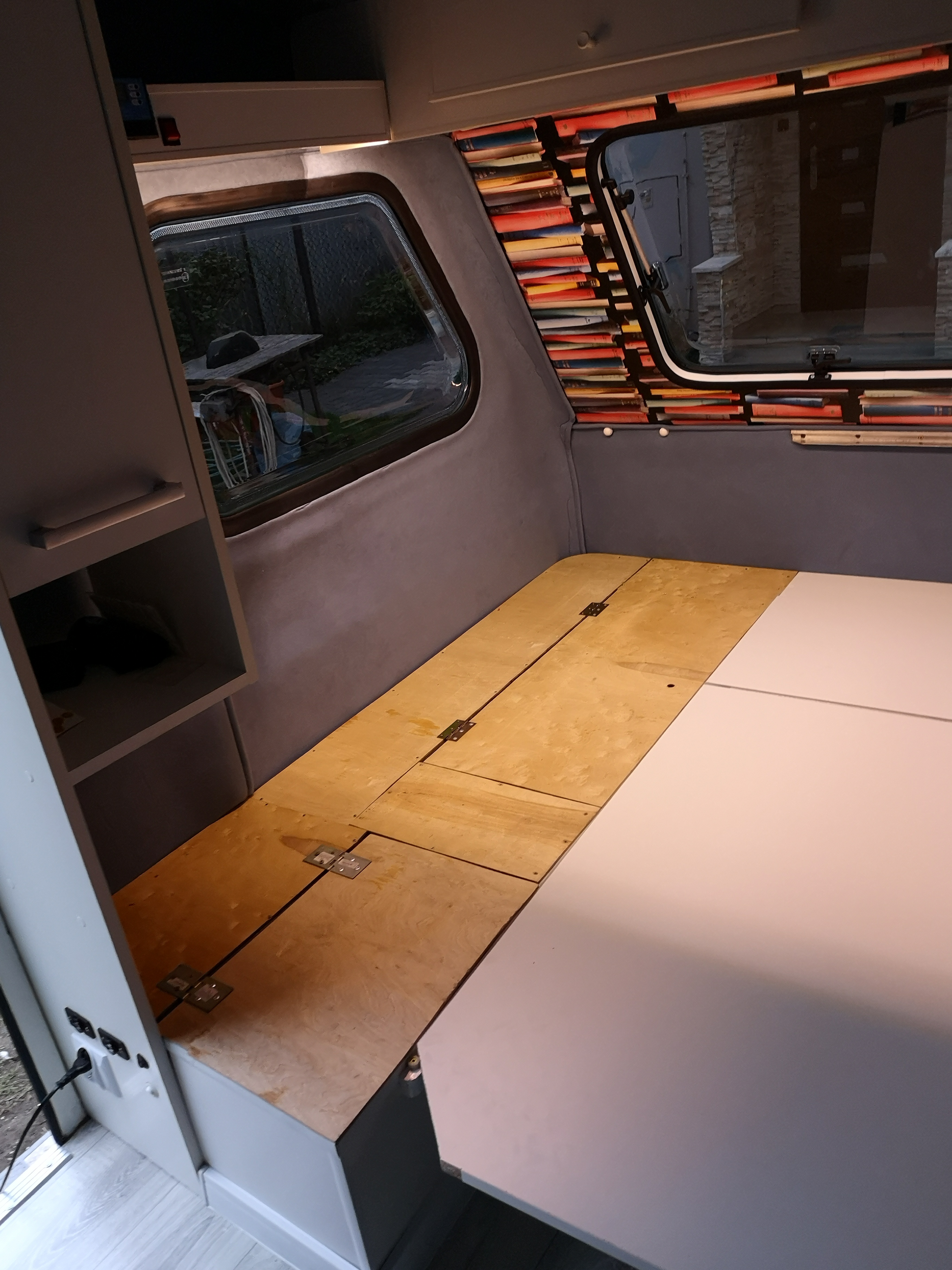 Zrobiłem półkę nad tylnym oknem (30cm głębokości), dwie kanapy, instalację 230v, na drzwiach kosz i materiałowe schowki. Powierzchnia Łóżka po rozłożeniu ma wymiary 185 x 165cm. Muszę jeszcze sklejkę z kanap obszyć szarą wykładziną i zabieram się za łazienkę i kuchenkę. W sumie pozytywnie mnie zaskoczyła ilość wolnego miejsca pod łazienkę - zobaczymy jak to wyjdzie. No i już zacząłem przerabiać podnośniki dachu powinno być wyżej o około 5cm. Kilka foto aktualnego stanu.