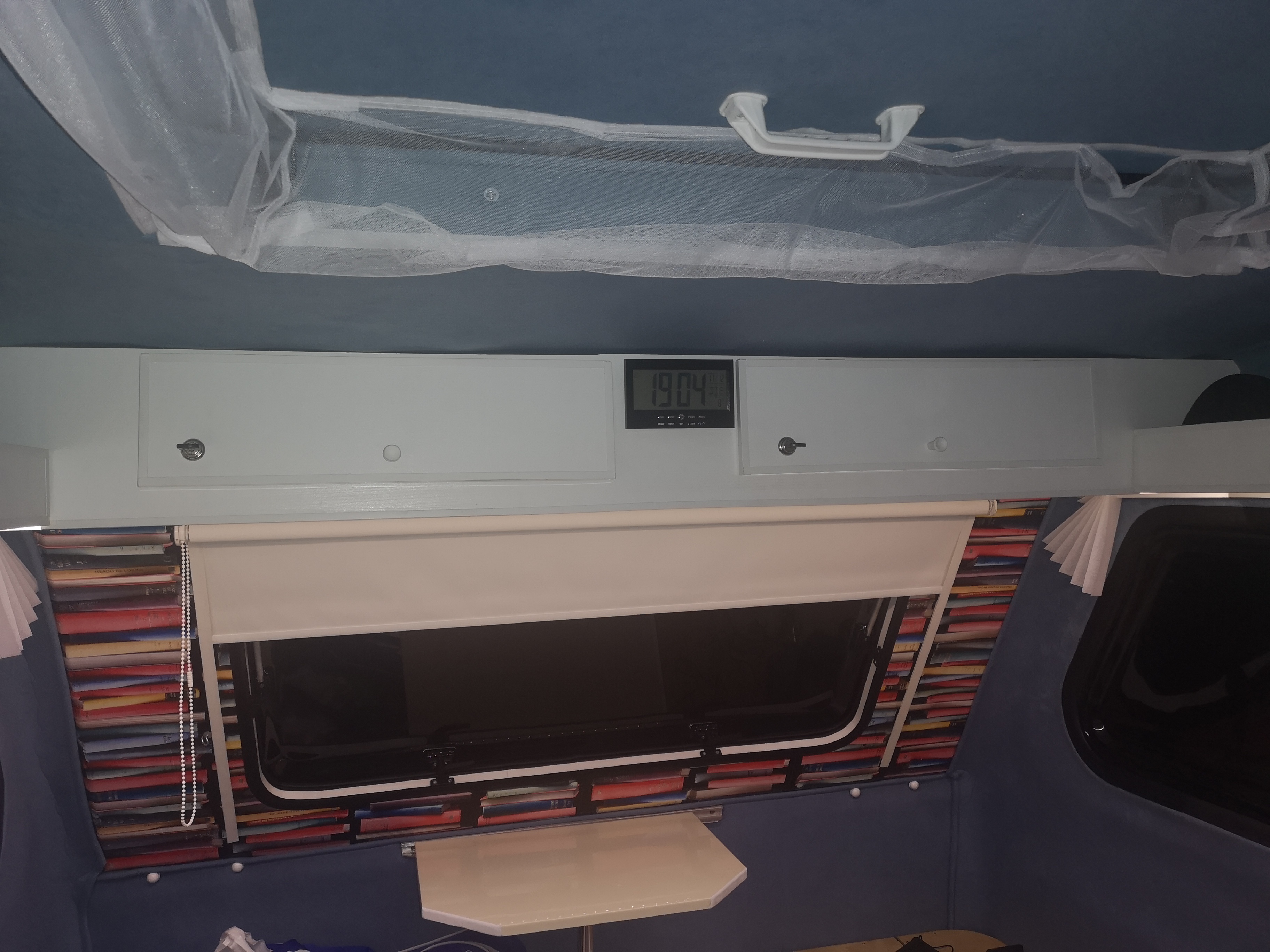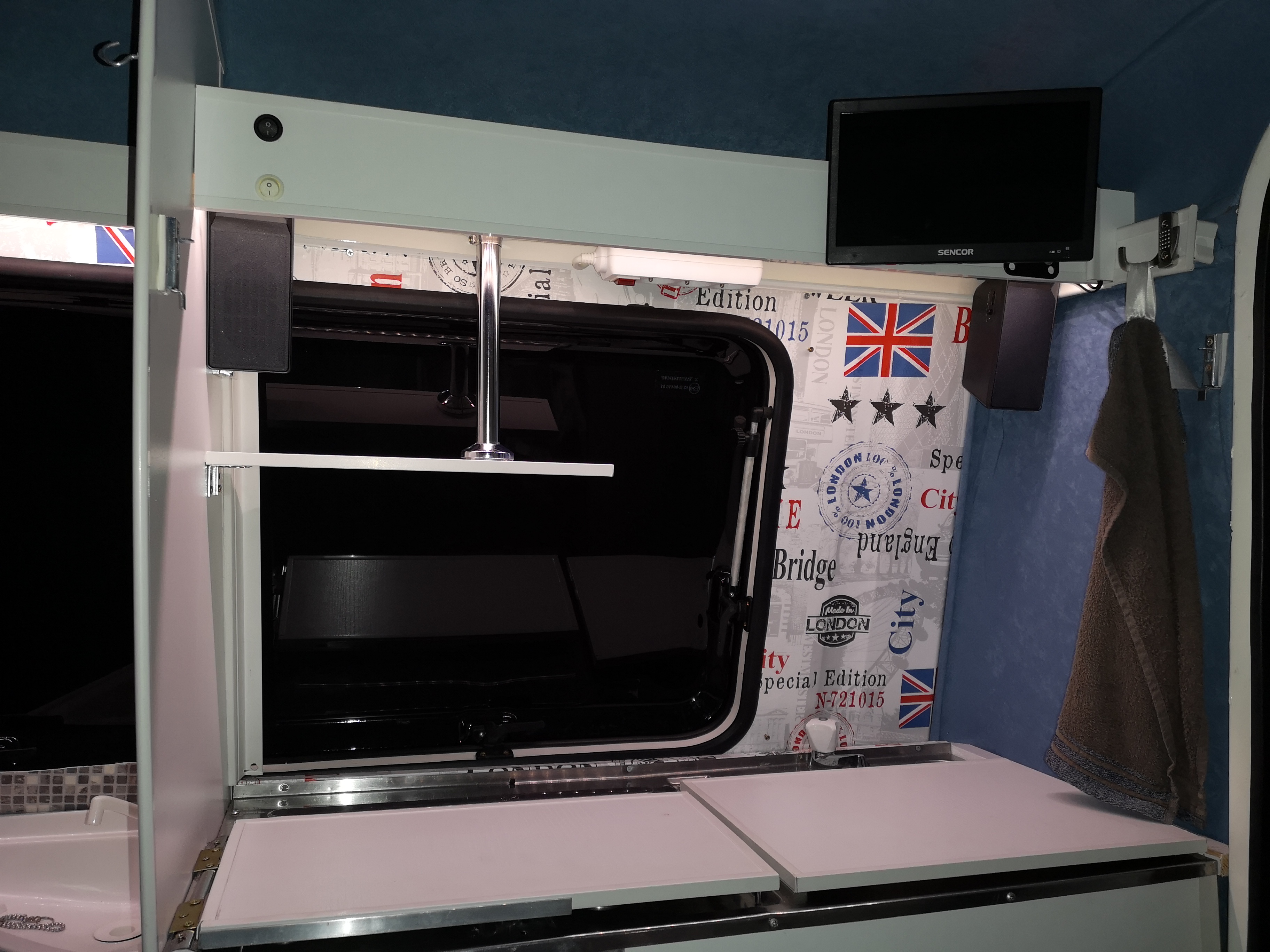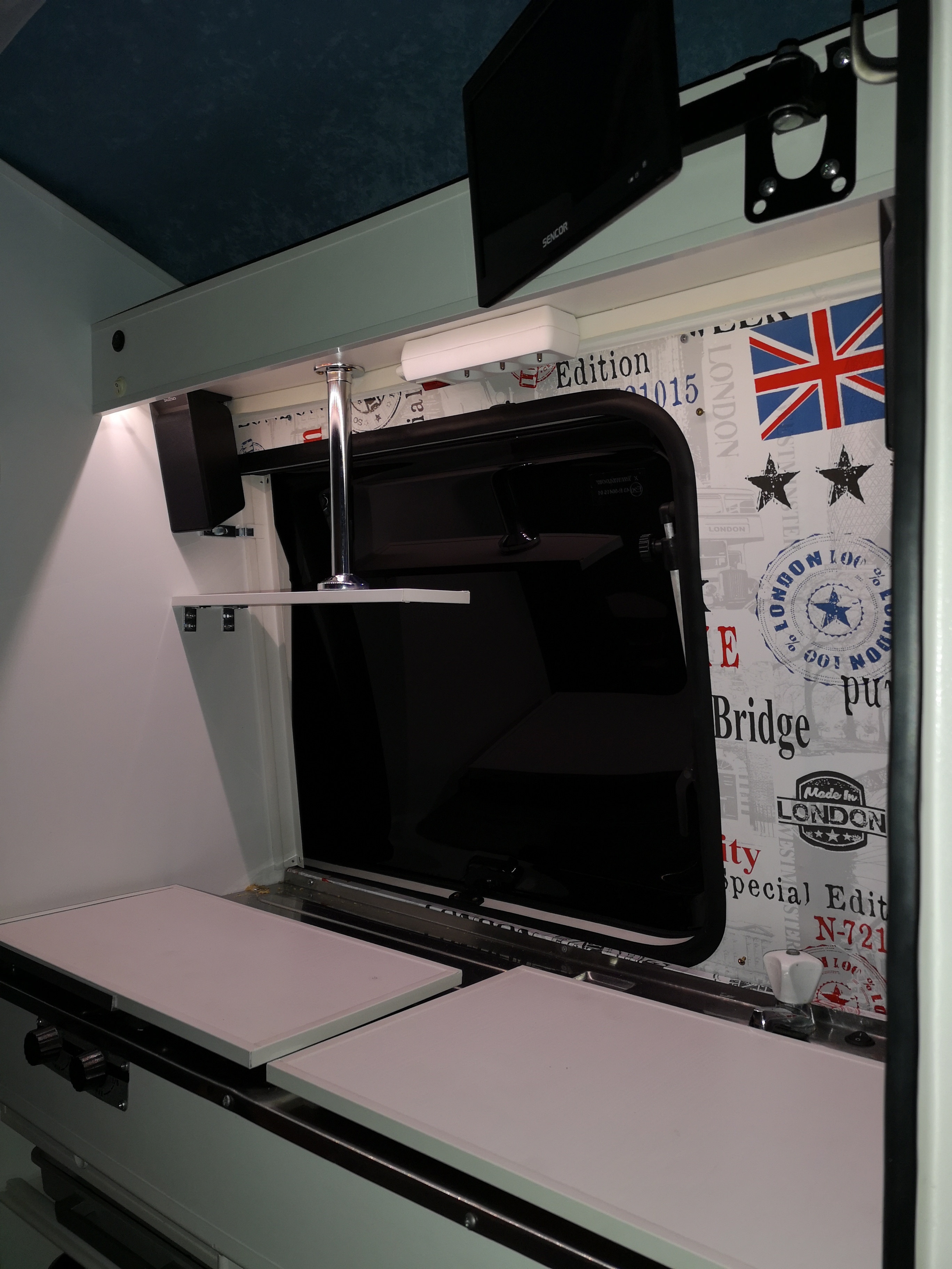 Radio z bluetooth zamontowane do tego dwa głośniki, skromne (ale dające radę) Thomson. W całości gra przyjemnie. Wizualnie dodaje uroku. Dołożyłem jeszcze tylną zwijaną roletę.