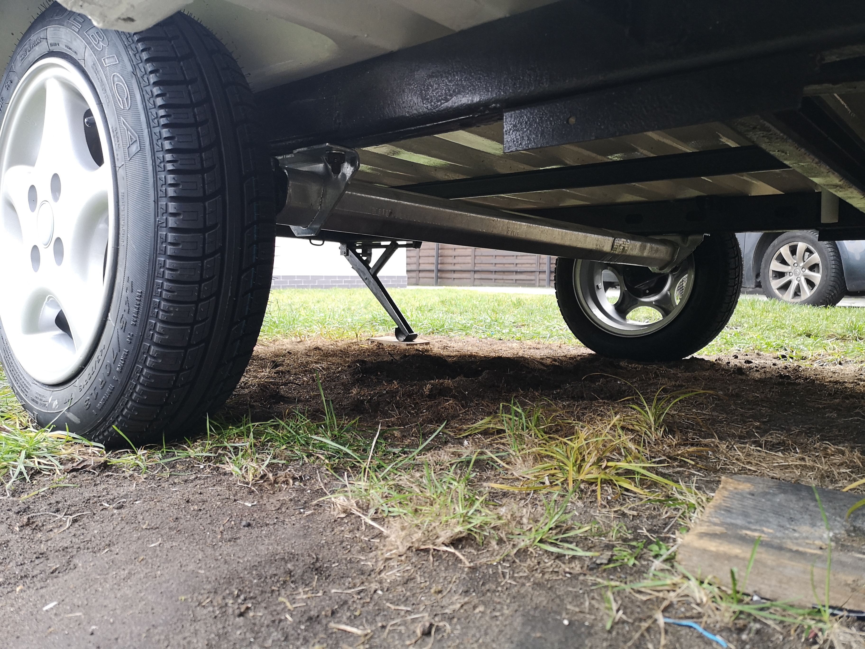 Nowe zawieszenie założone. Jako ciekawostka przeprowadziłem dziś ważenie... AL-KO oś (22.1kg) jest lżejsza od odryginalnej osi (29.5kg) o 7,4kg. Natomiast alufelga rozmiar 13 z oponą (11.1kg) jest cięższa od koła z oponą typu cytrynka (8.8kg) o 2.3kg. Czyli dwa kola - dochodzi 4,6kg. Całe nowe zawieszenie powoduje spadek masy przyczepy o 2,8kg. Zawsze to cieszy